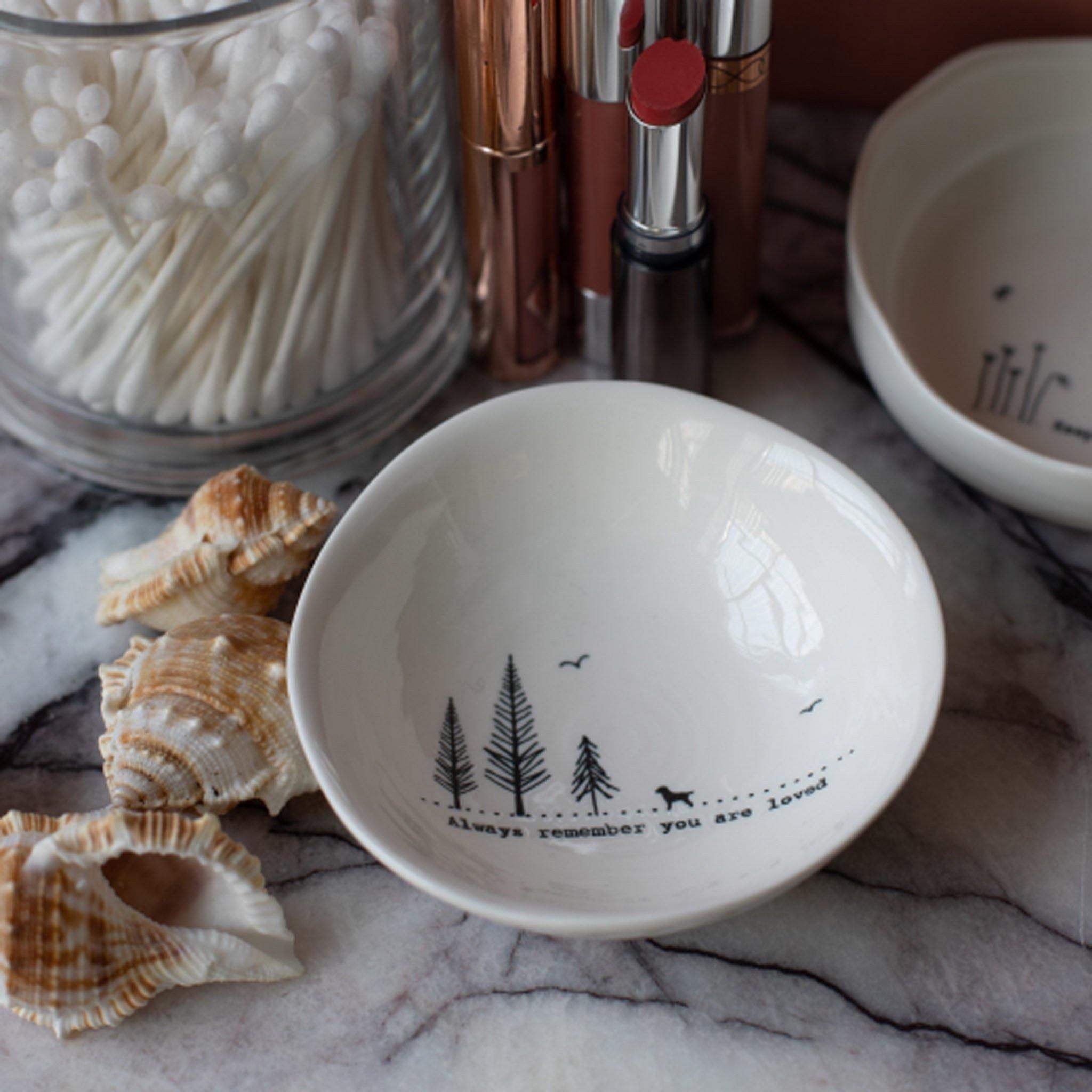 This white porcelain trinket dish with “Always Remember You Are Loved” embossed in typewriter style font and an outdoor forest scene, is a sweet gift for a friend, daughter or for yourself. With non-uniform edges this piece looks beautifully handmade and is just large enough to contain jewellery, a few pieces of make-up or keys and coins.