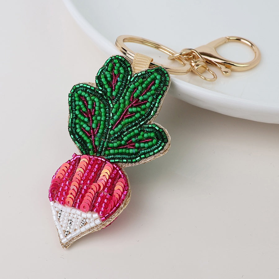 Add quirky touch to your bag with this embellished radish bag charm and keyring. Decorated with sparkling beads and sequins in green, white, and pink, the playful radish design is full of character and charm. Finished with a gold-toned keyring and secure lobster clasp, it easily attaches to your keys, handbag, or backpack. A delightful little accessory that makes a unique gift or a cheerful treat for yourself.