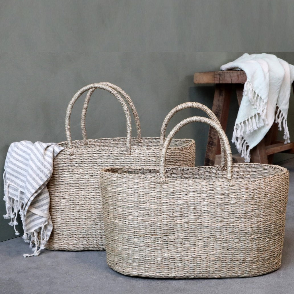 These beautiful oval shaped baskets with handles are made with natural seagrass. Available in two sizes they are sold individually and measures as follows: