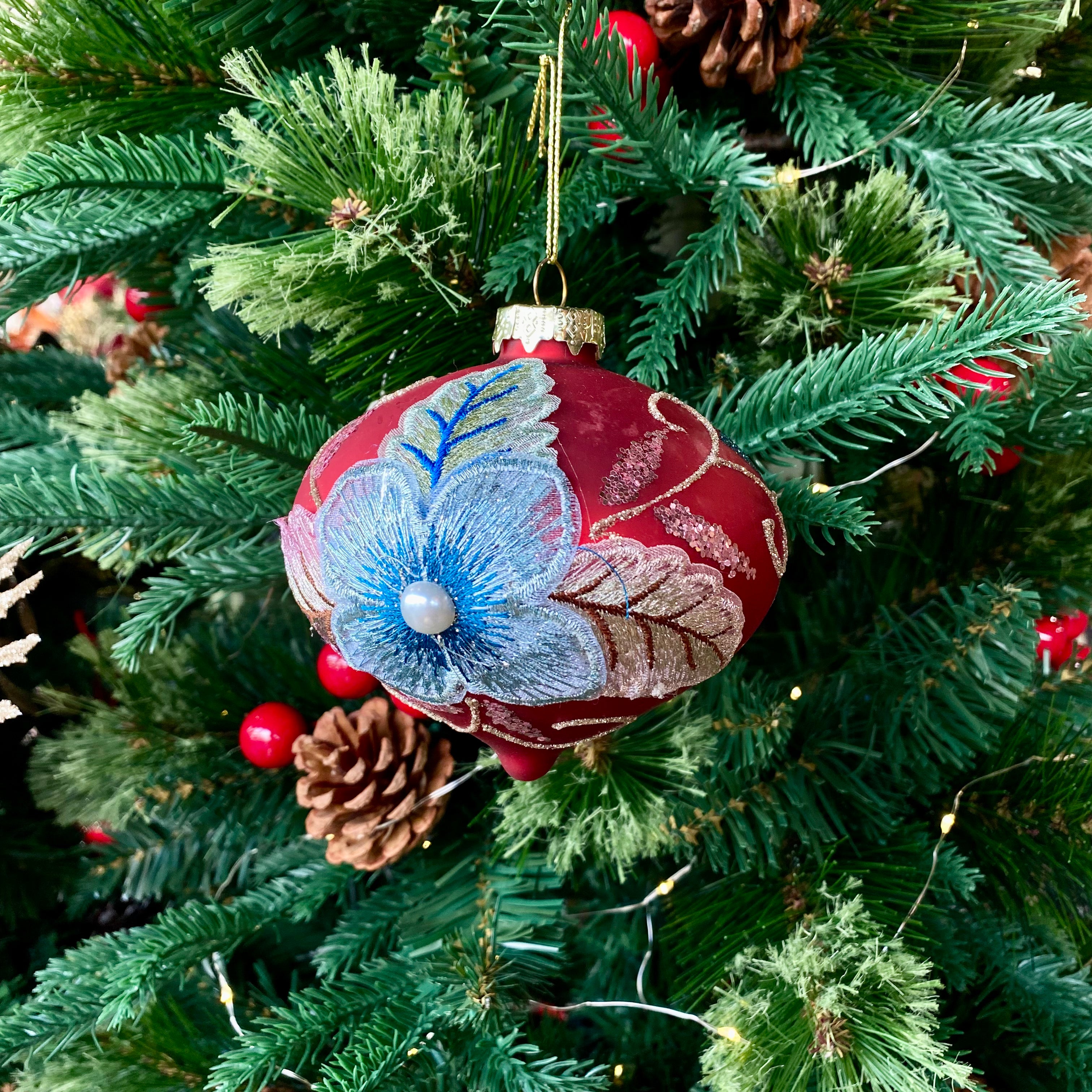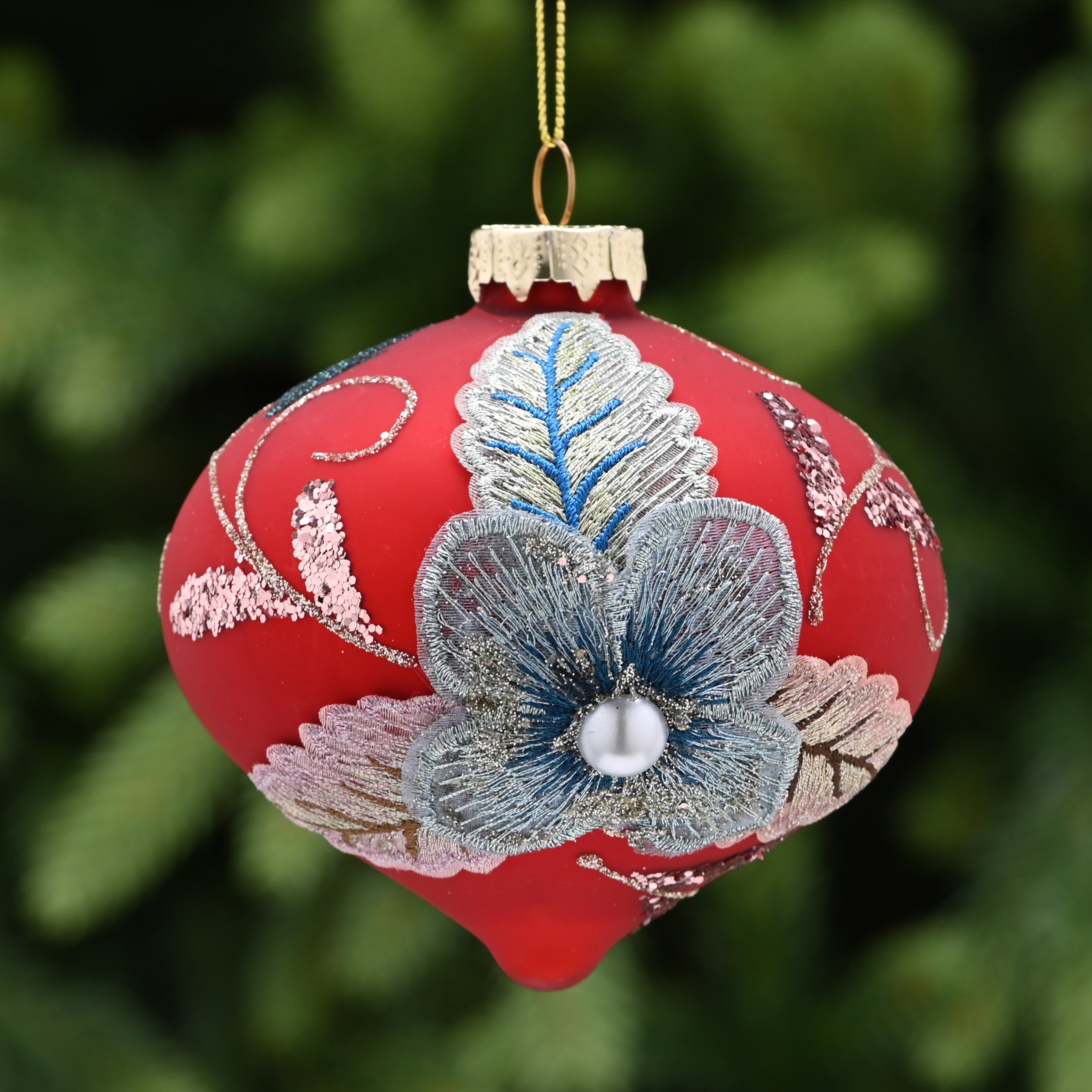 Bauble - Red Glass Onion Embroidered, 10cm is an opulent highly decorative oversize bauble which is sure to make a statement on your christmas tree this year. The pretty embroidered floral detailing will ensure this is a bauble you cherish year after year with it's matt red glass onion with subtle blue and pink fabric flowers and sequin swirls and details.