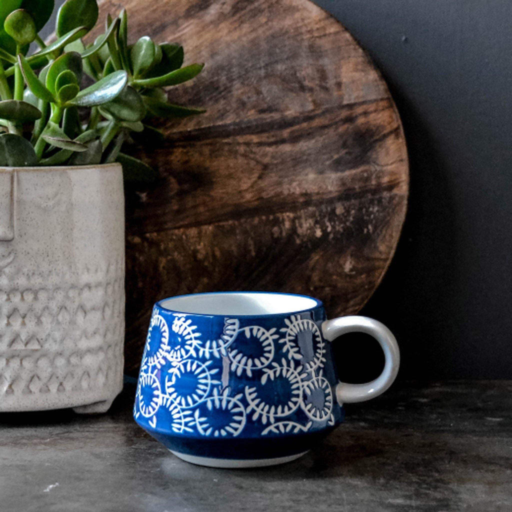 Blue & White ceramic mug with hand-painted embossed leaf pattern. With its concave base this delicious mug fits perfectly in your hand. H8cm Dia.11cm