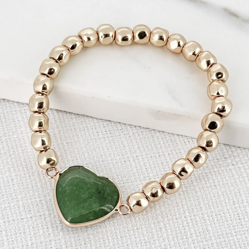 Bracelet - Stretch Gold Bead & Green Heart. This gold beaded stretch bracelet has a vibrant green heart charm for those who love a pop of colour with a touch of romantic charm.
