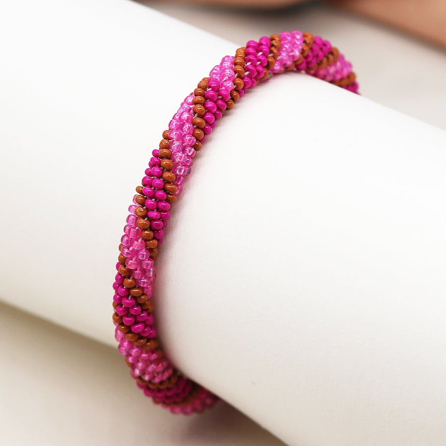This gorgeous bracelet consists of a colourful combo of pink and tan beads. Featuring a stretchy internal material, this bracelet will be a perfect fit for your wrist. A lovely gift for yourself or a loved one.