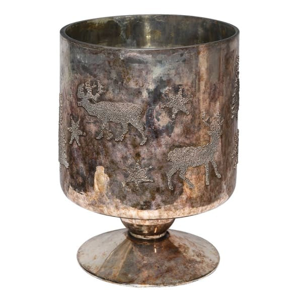 Made from tarnished oystered coloured glassm this candle holder has a beautiful patina, and a delicate scene with deer, fir trees and stars picked out in texture. It stands elegantly on an glass stem base, elevating it slightly. This is perfect for tea lights or votive candles alike.