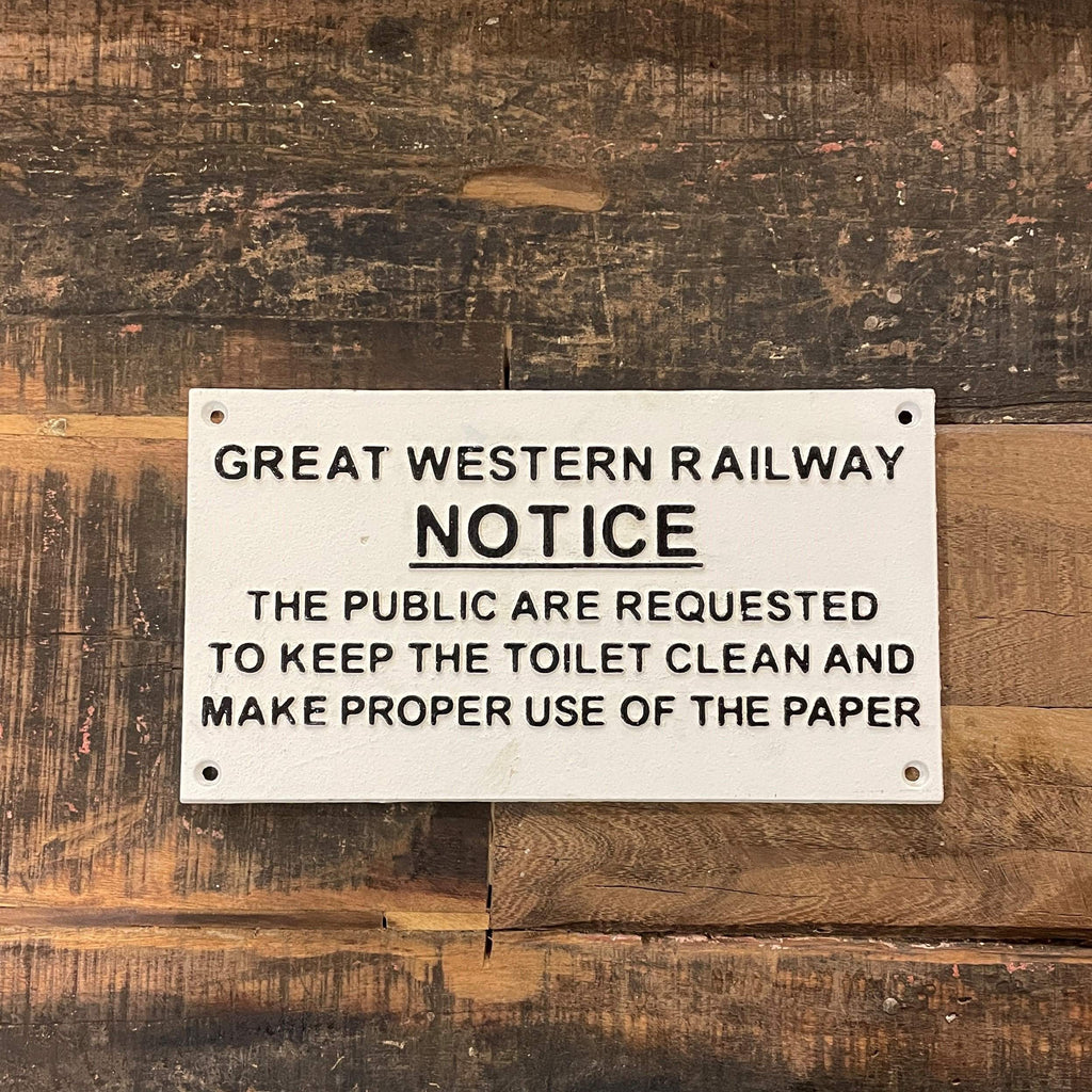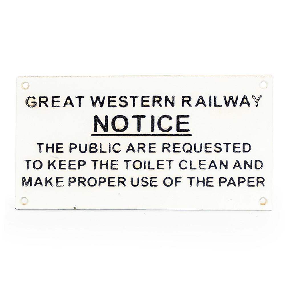White Painted Cast Iron Sign with Black Font: "Great Western Railway NOTICE The Public are requested to keep the toilet clean and make proper use of the paper.