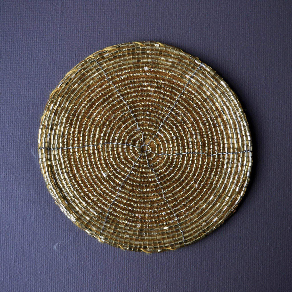 The beaded coasters have a twinkling gold colour and measure 10cm diameter. Matching placemats are also available.