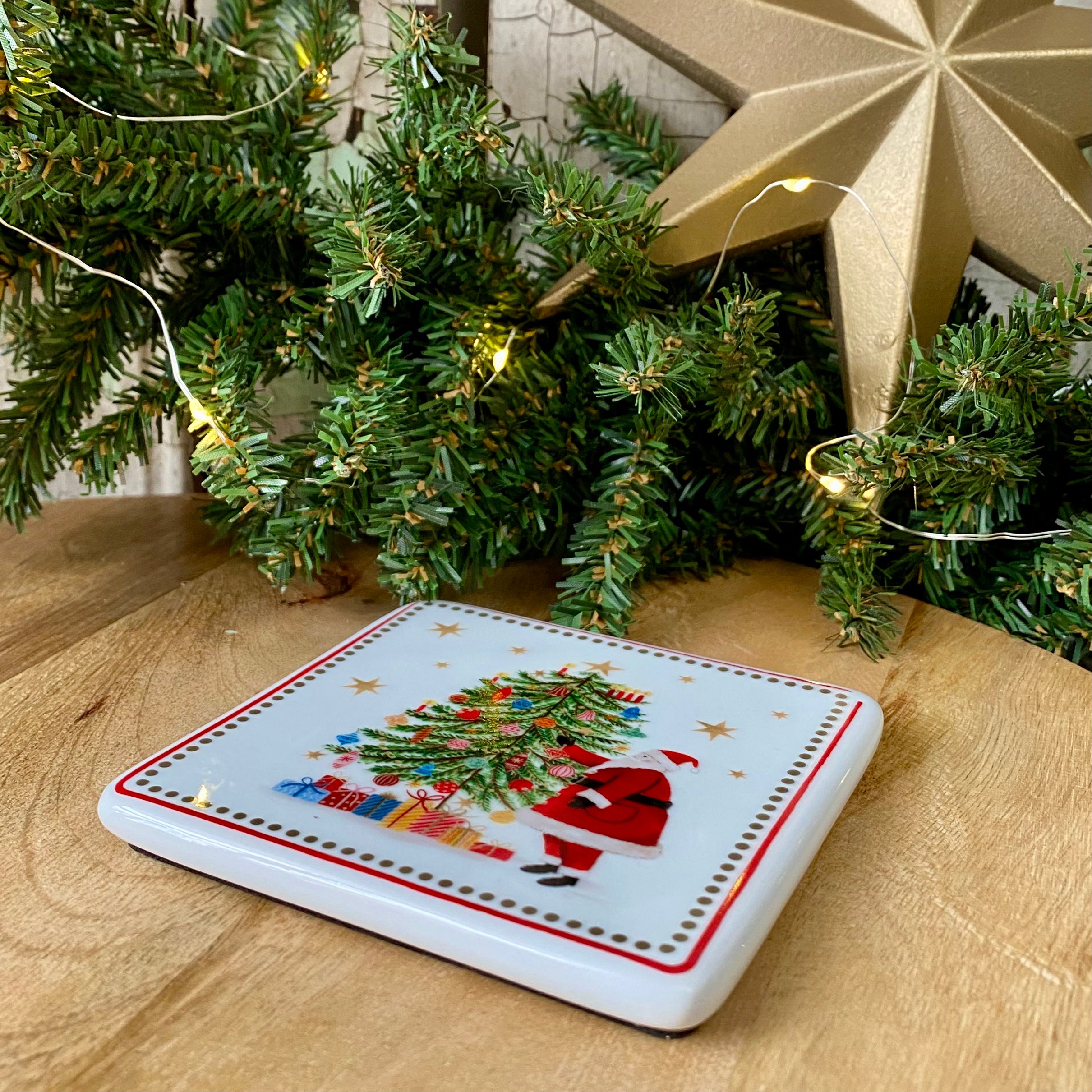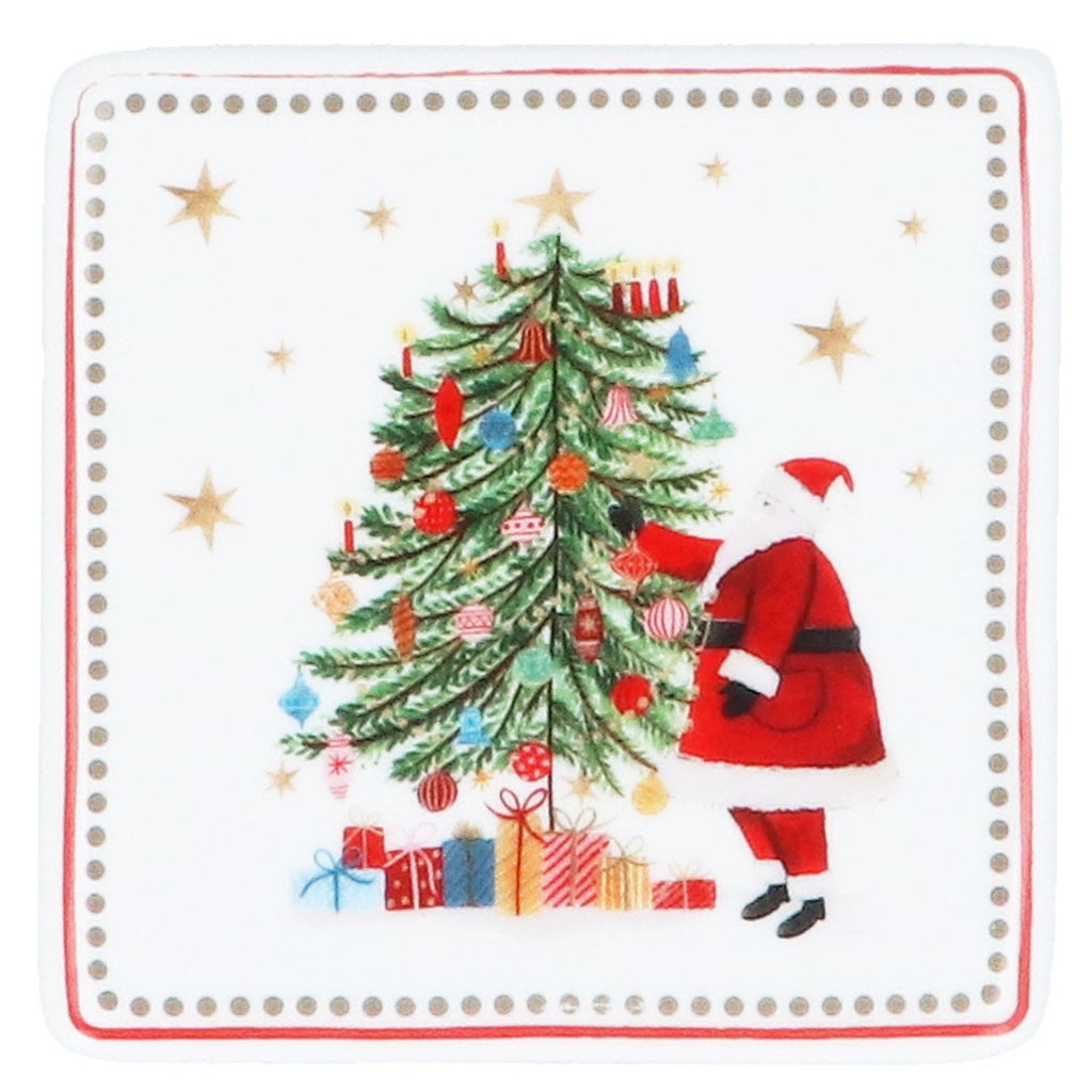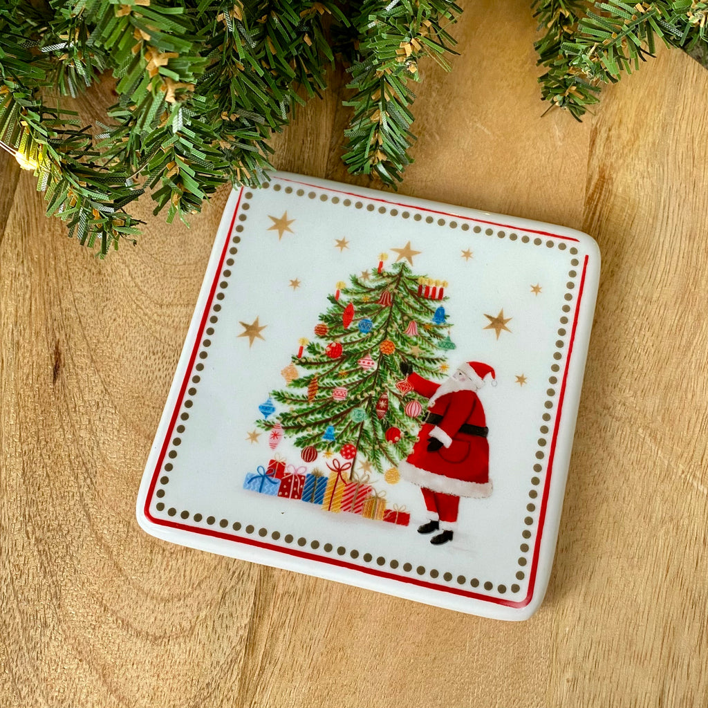 Traditional Christmas Tree & Santa Setting on a porcelain coaster. Perfect paired with the matching mug.