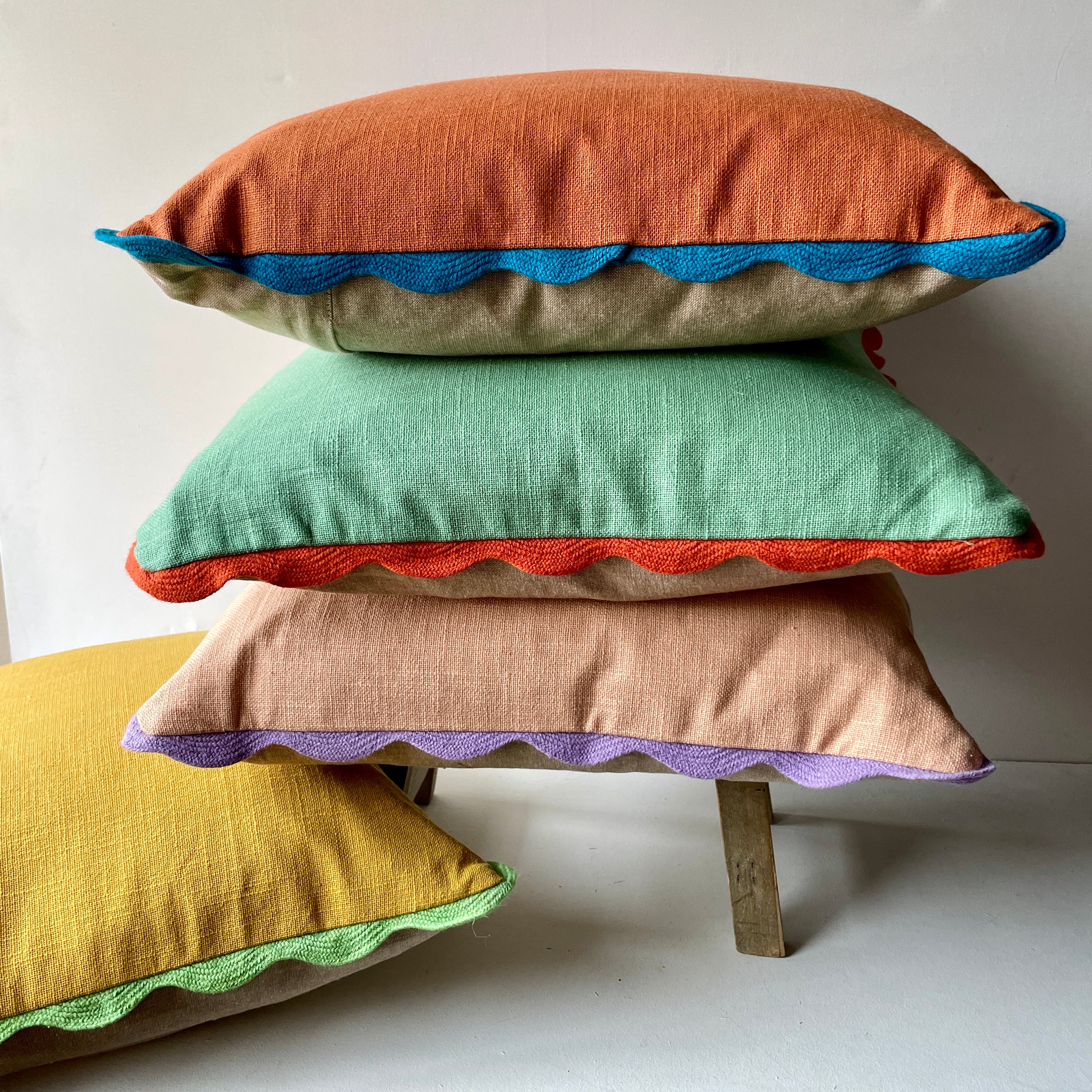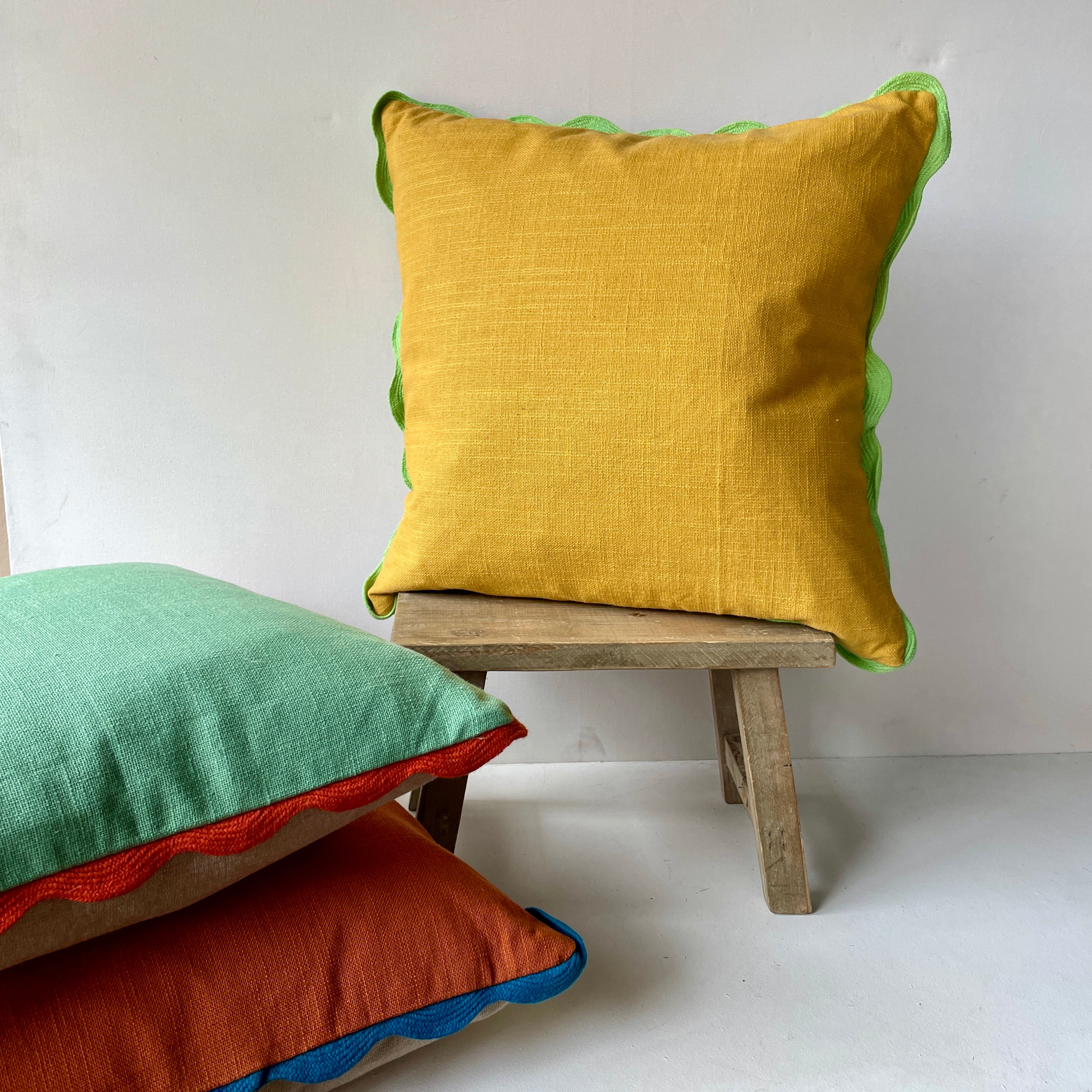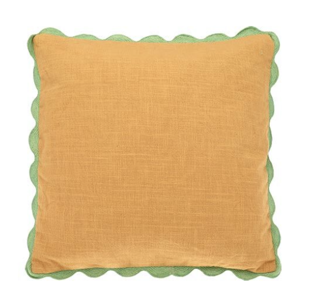 Square 100% cotton cushion.  The front of the cushion is Ochre Yellow which is finished with a scalloped border in green.  The reverse of the cushion is a natural chambray  with a zip closure for easy removal of pad.