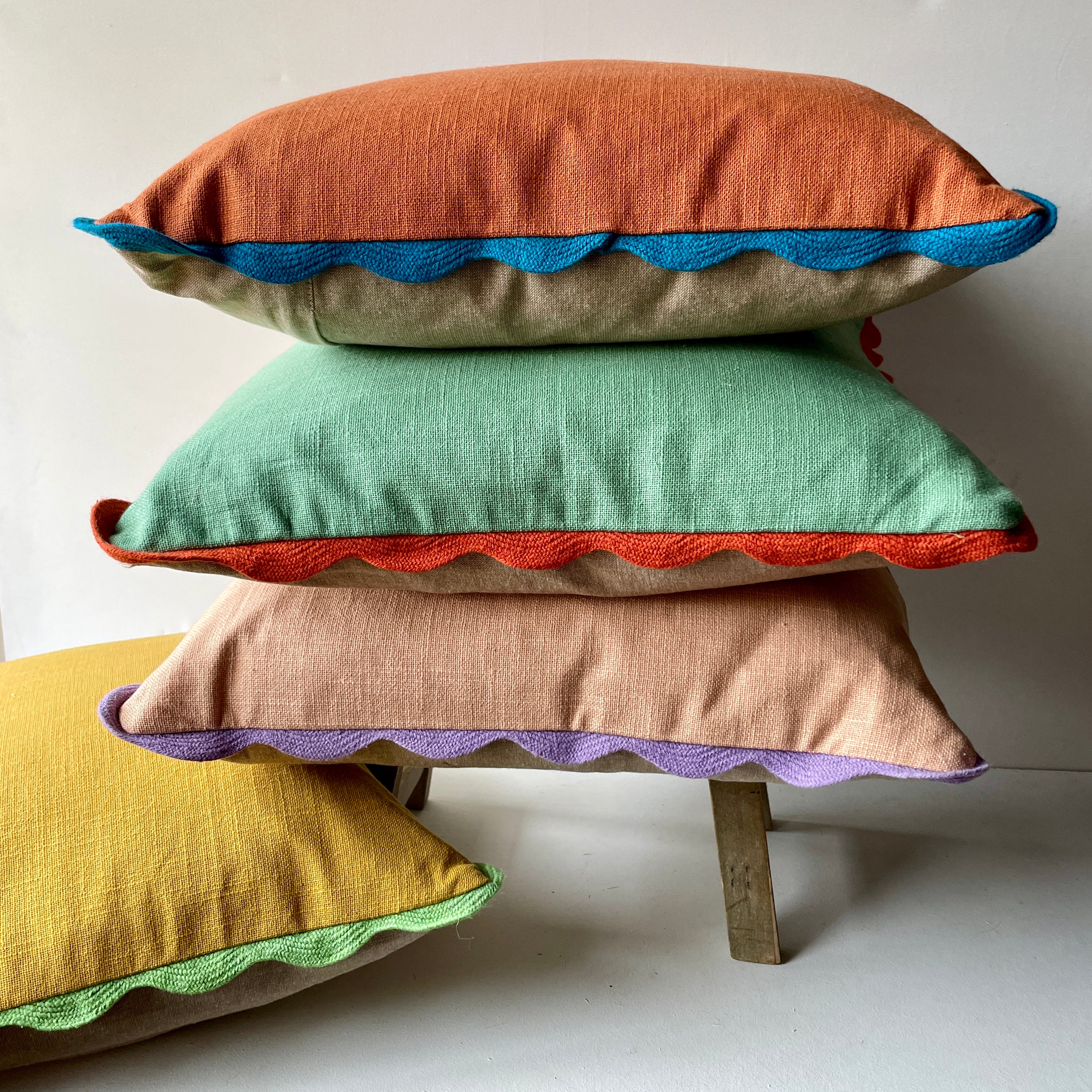 Perfect to mix and match, this square cushion is made from 100% cotton .  The front of the cushion is turquoise green which is finished with a scalloped border in terracotta.  The reverse of the cushion is a natural chambray and features a zip closure for easy removal of pad.