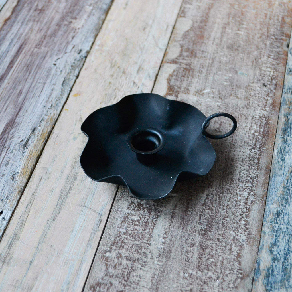 Made from decoratively shaped blackened metal, and with a little finger loop to allow you to carry securely. This little chamber stick would look beautiful simply styled alone, or as a collection of romantic objet on a dressing table tray.