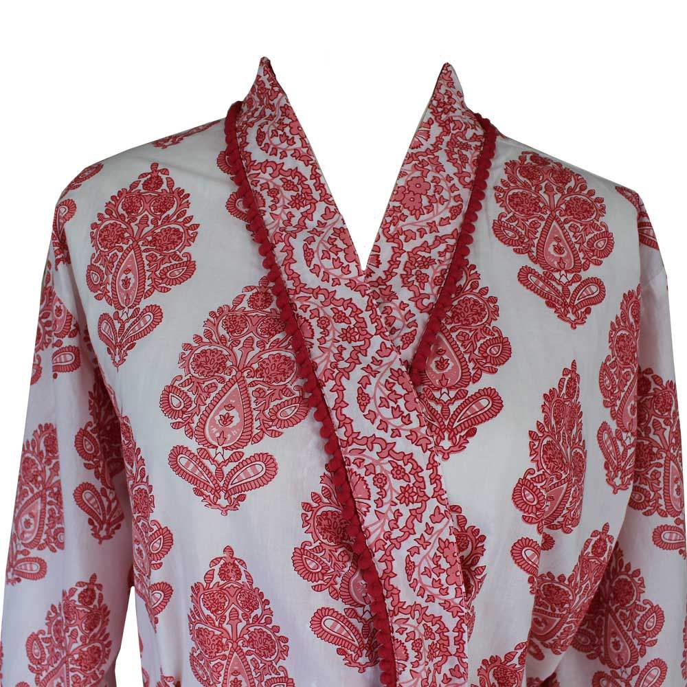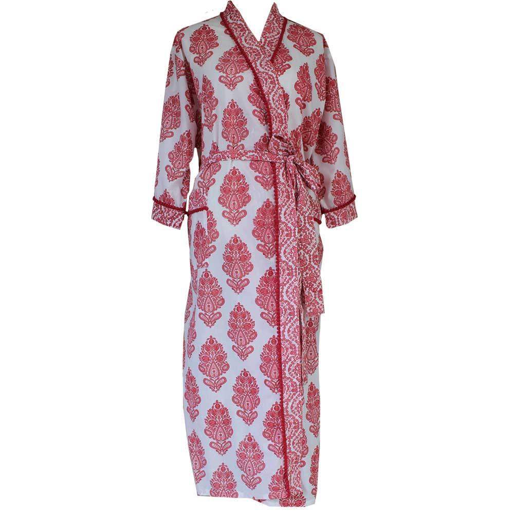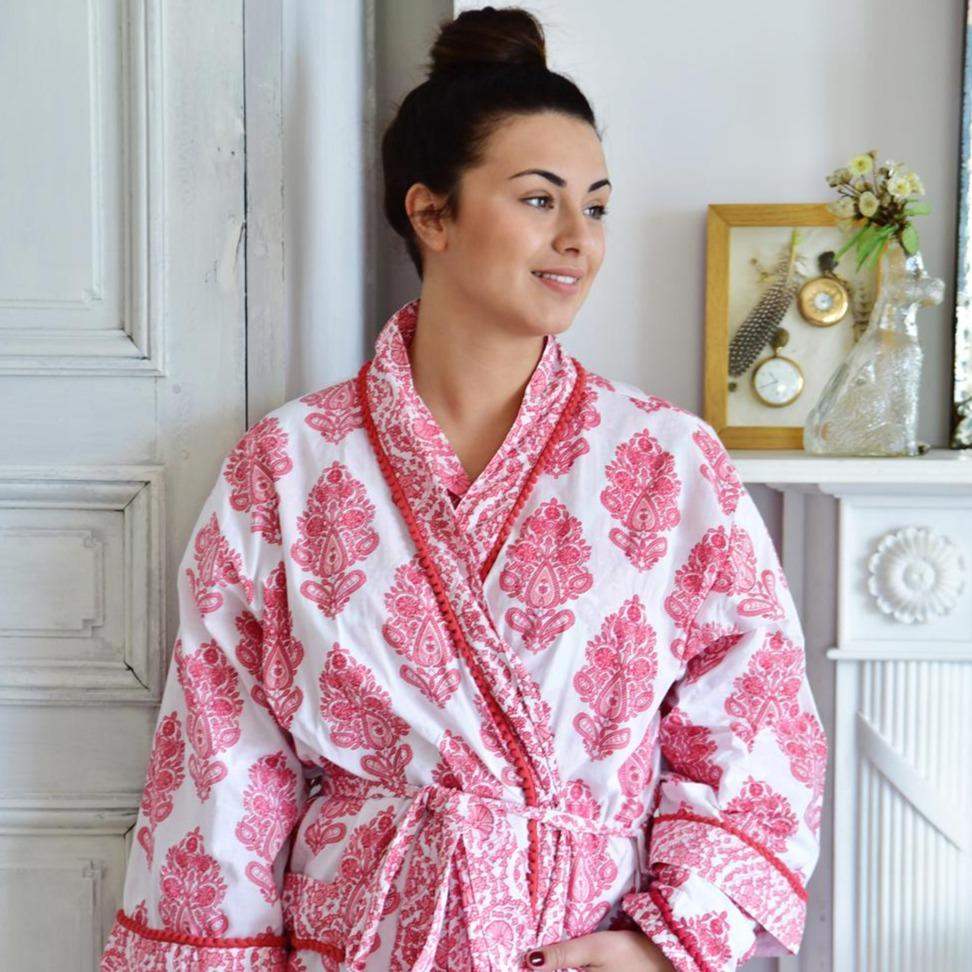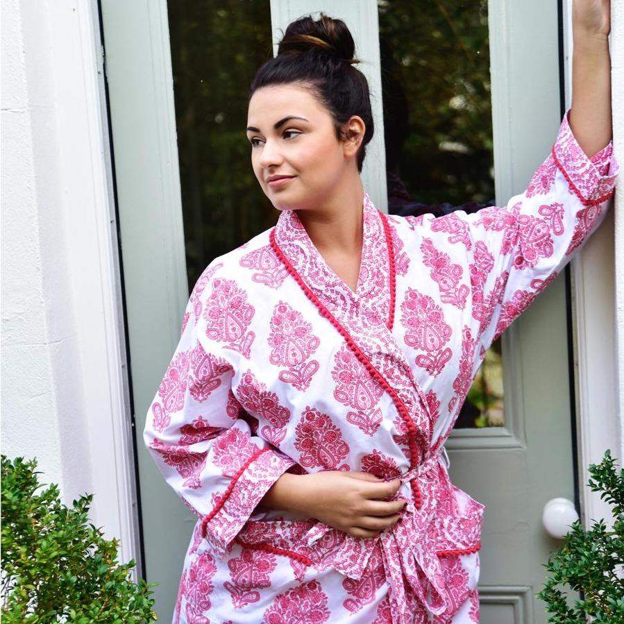 Designed using traditional Indian technique of woodblock printing in a bold pink and white pattern. This gorgeous dressing gown is made from beautifully lightweight cotton this dressing gown is super comfortable and easy to wear. Contrasting green edges and bobble trims, this gown feels fresh, trendy and totally unique.