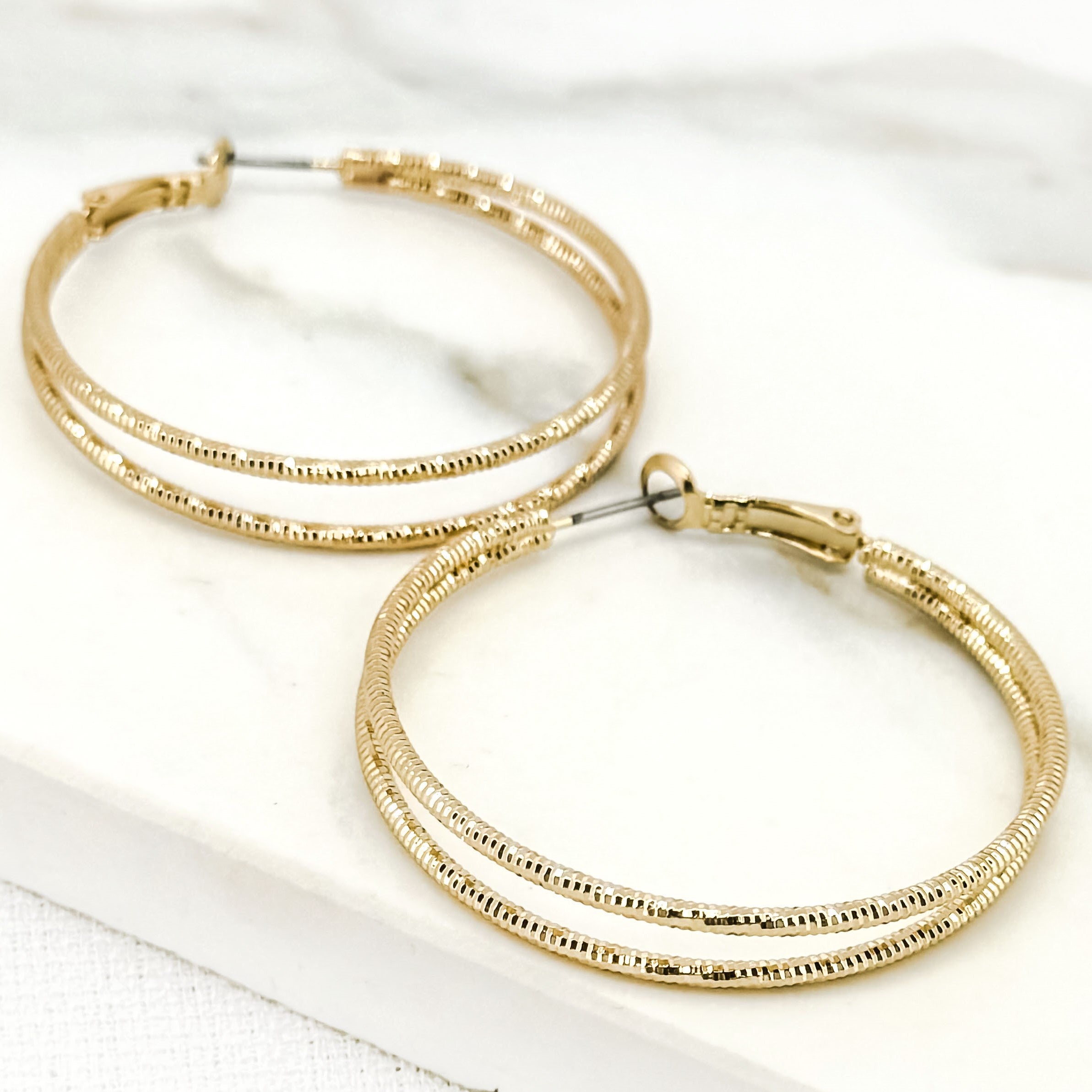 Earrings - Gold Faceted Double Hoop. These interlocking hoops reflect light beautifully without completely overpowering your look, a modern twist on a classic hoop.