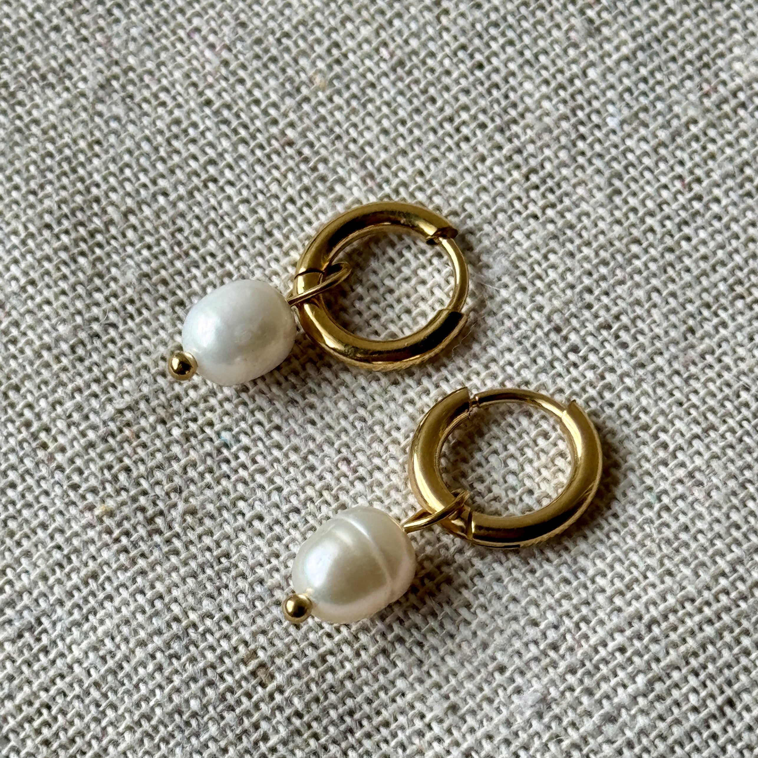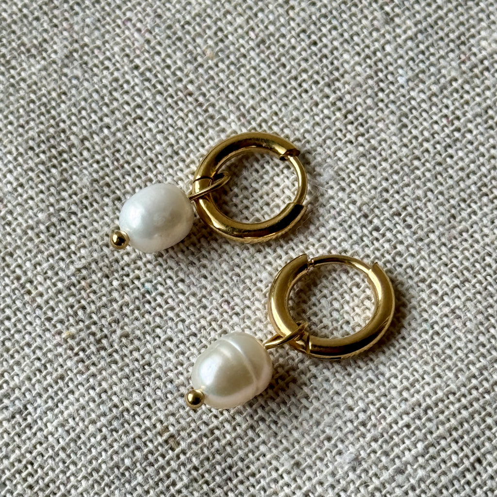 Everyday Earrings - Gold Huggie Hoops, Freshwater Pearls this pair of waterproof huggie hoops with a little real freshwater pearl will add instant charm and sparkle to any outfit. The clasp hoop fastening makes them super easy to snap on and off - A gorgeous gift for yourself or a friend.