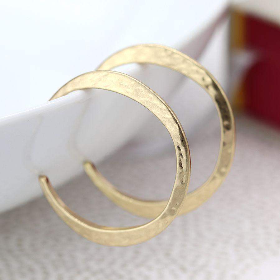 Gold plated open hoop stud earrings with a worn finish and irregular beaten surface