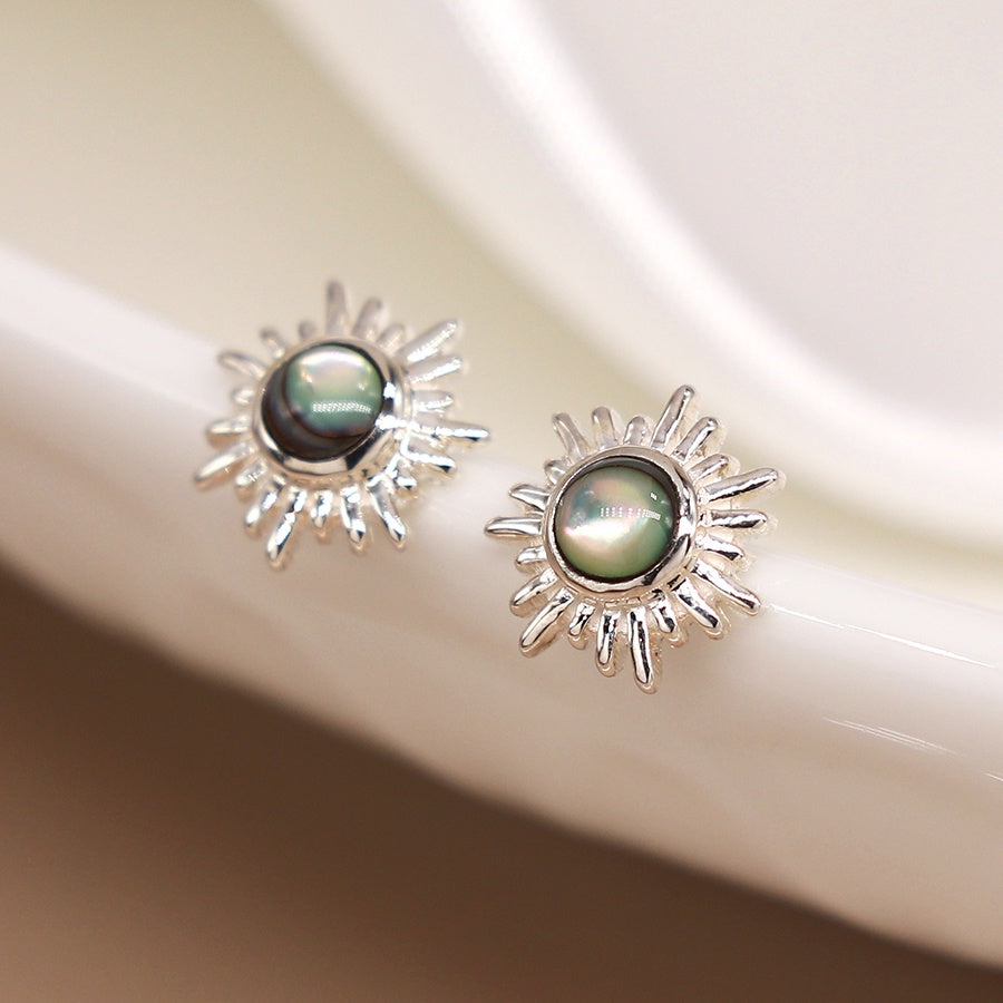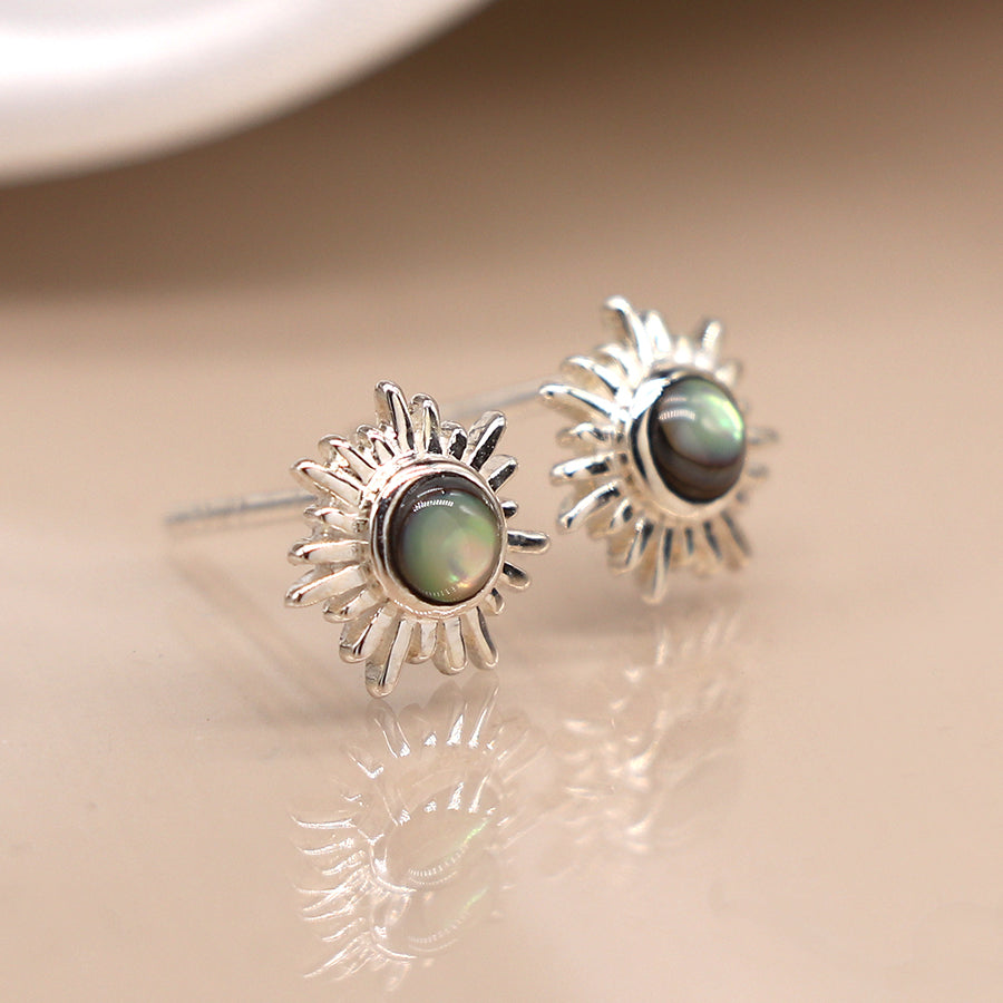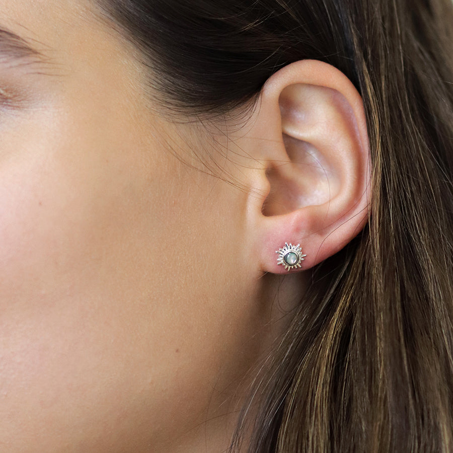 Timeless sterling silver stud earrings featuring opalescent stone in a silver sunburst settings.