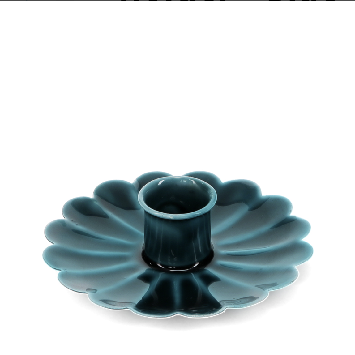 Cast metal candle holder with a dark blue enamel finish, with a pan shaped like a flat flower tray to catch dripping wax.