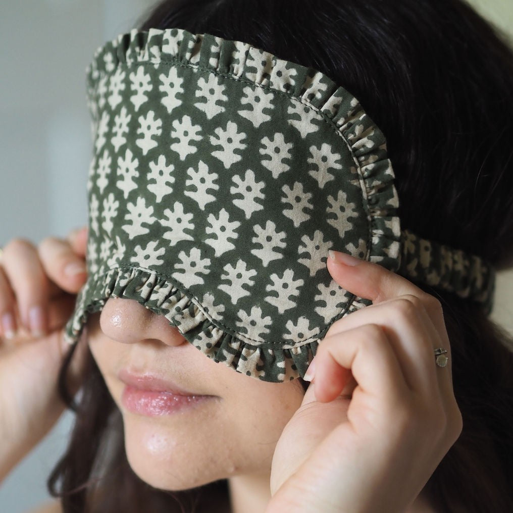 This Forest Green Cotton Eye Mask features a beautiful blockprint design with a charming frilled trim. Crafted from 100% cotton, including a luxurious cotton velvet backing and filled with soft cotton padding, it offers both comfort and style. Handmade in India.
