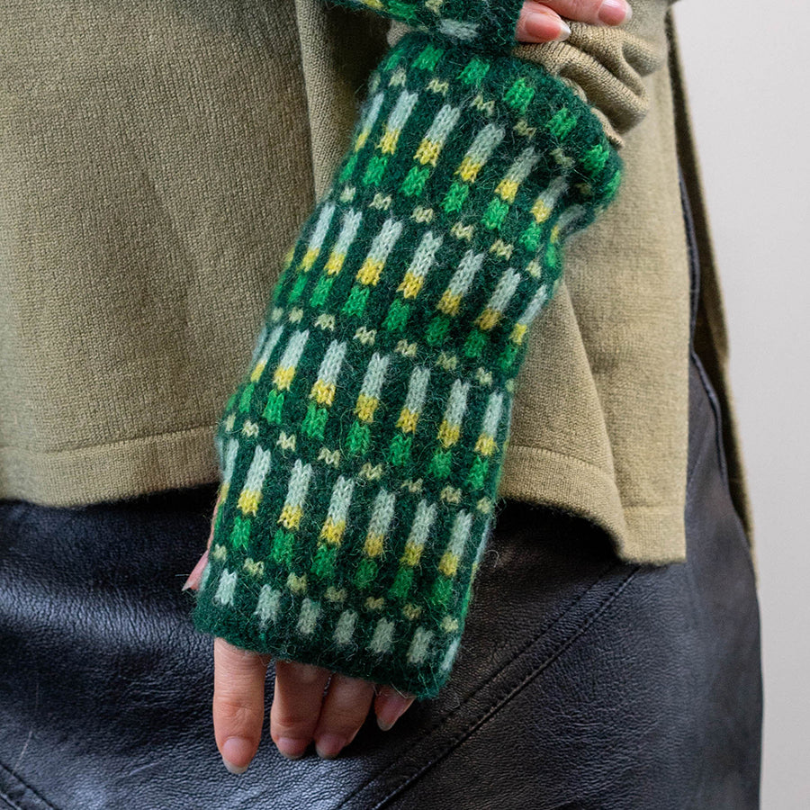 Pretty and practical are these green stripe wrist warmers or finger less gloves as they're also called. Scandinavians love wrist warmers as they help keep your body warm by protecting and insulating the wrist pulse.
