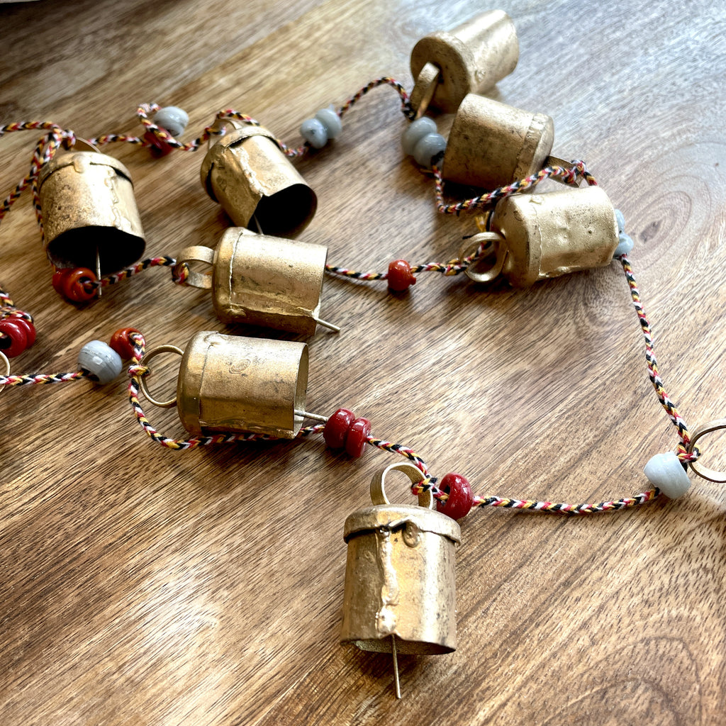 Authentic and beautifully bohemian Garland - Short Metal Bells is a gorgeous decoration suitable for all year round. Rustic hammered brass bells, strung with beads.