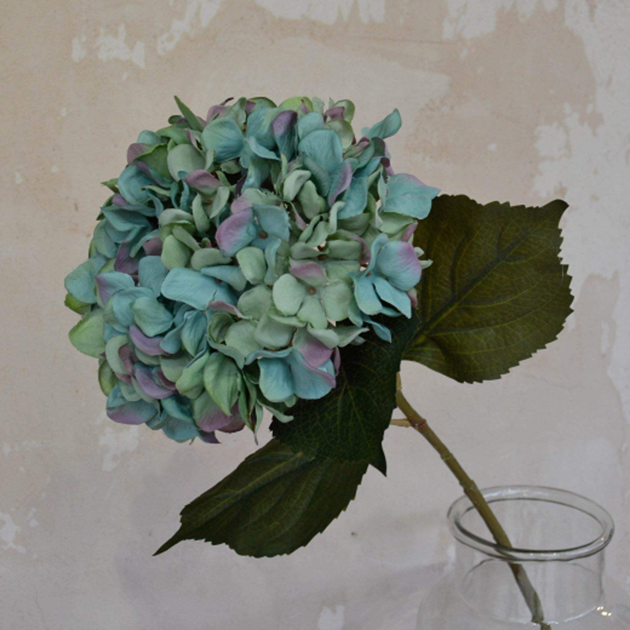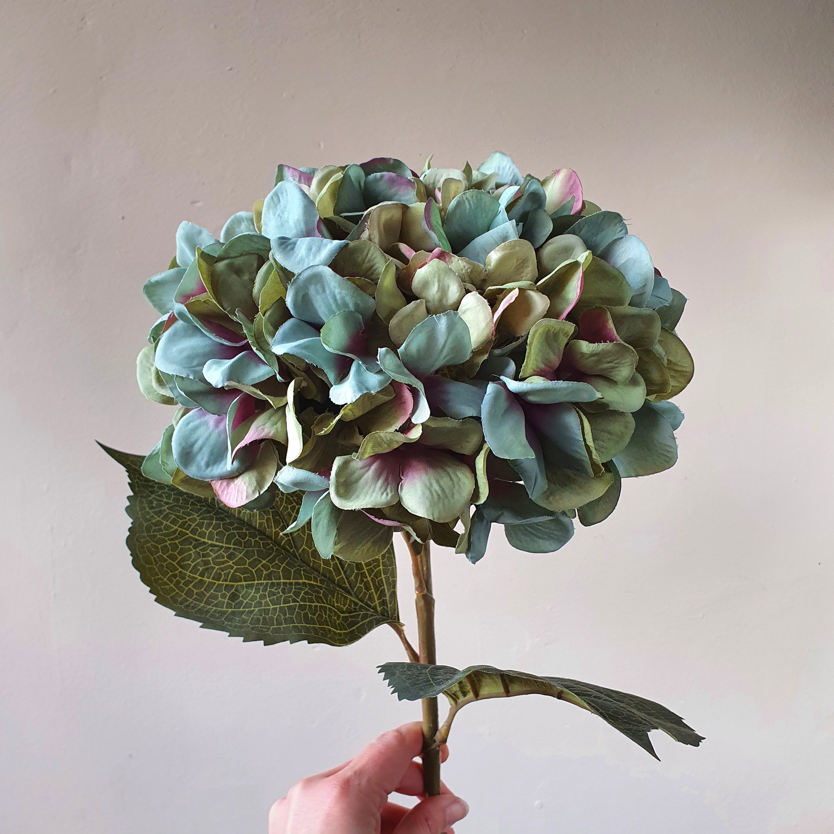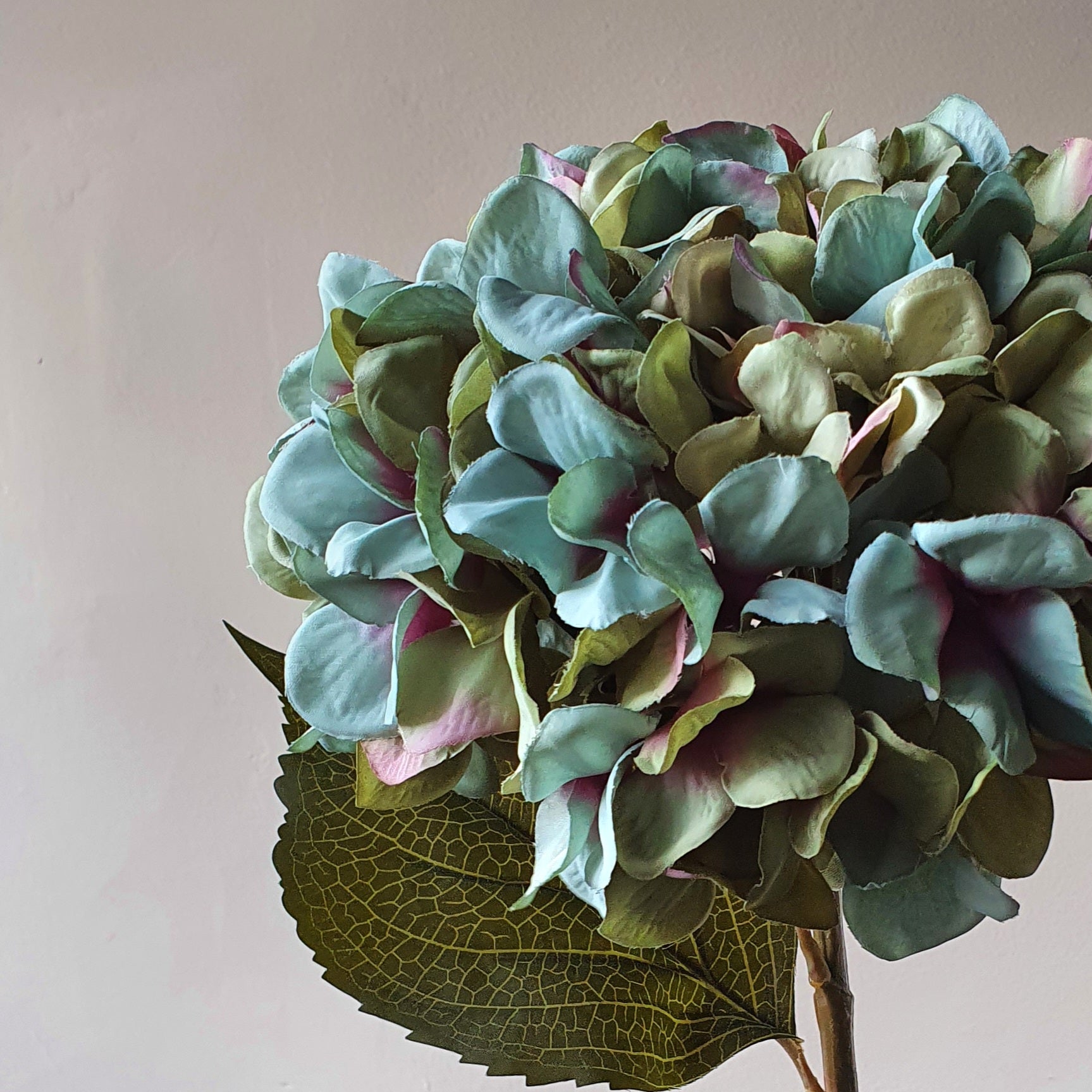Featuring stunning delicate blue and green petals with a little blush of pink, alongside lush green foliage. Giant Hydrangea Flower Stem - Antique Blue is from Gisela Graham. These stems look fabulous on their own or mixed with other blooms in a gorgeous arrangement.