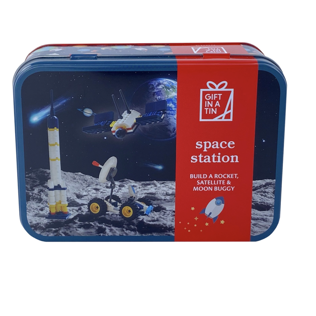 Gift in a Tin - Space Station. This magnificent set is perfect for any curious mind (young or old!) which yearns for space exploration. It contains tools to put together over 180 plastic building blocks included, creating three cool space models: rocket, satellite and moon buggy. The model kit contains all the instructions you need and is stored in a stylish metal tin.