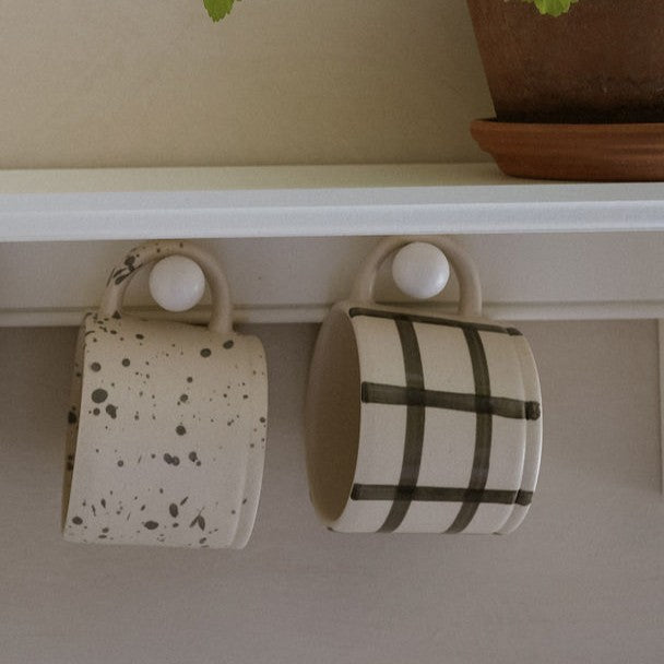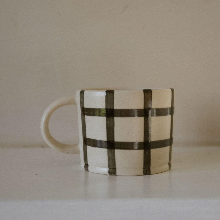 Hand finished with pebble grey gingham check pattern over a white background, each mug is unique, bringing a personal touch to each sip.