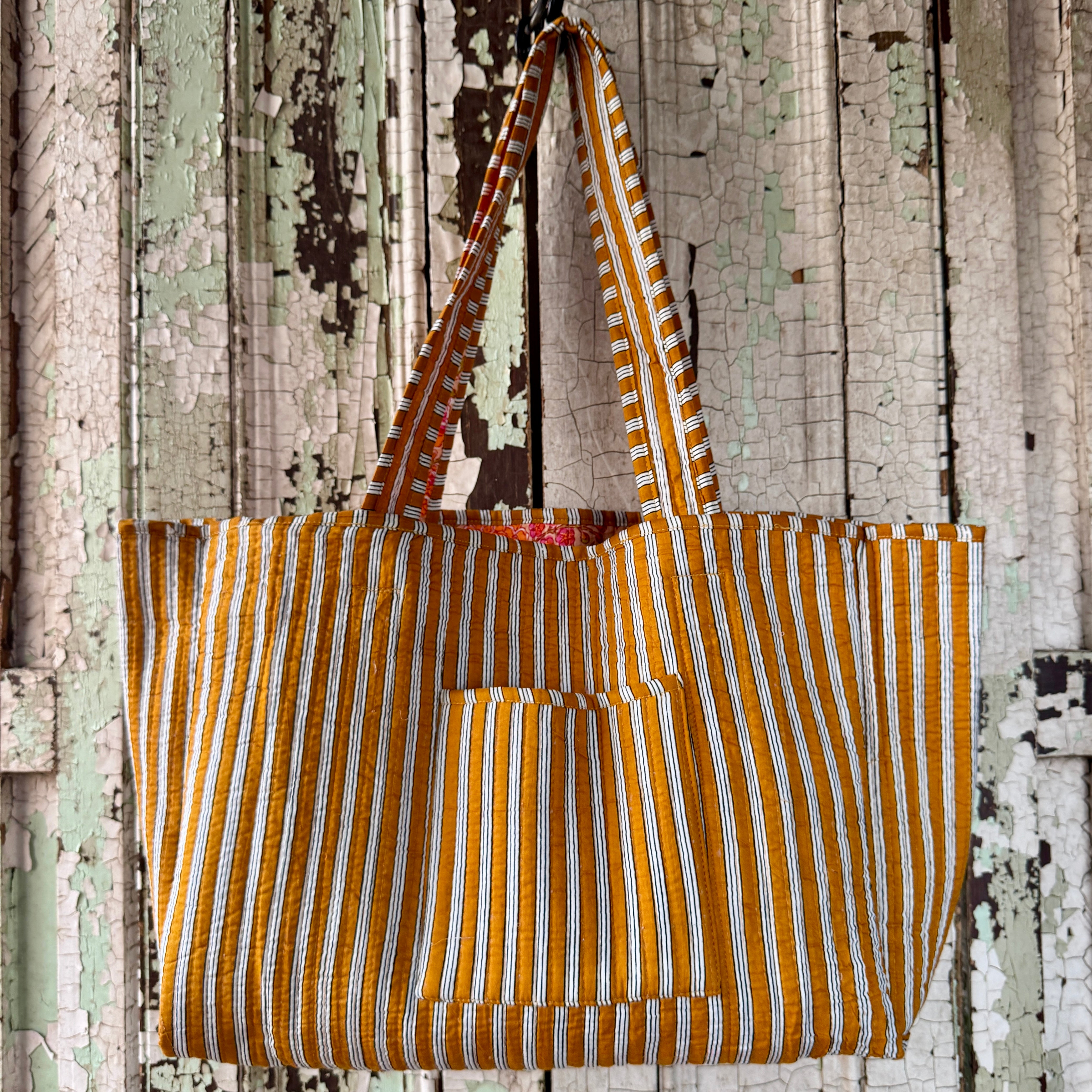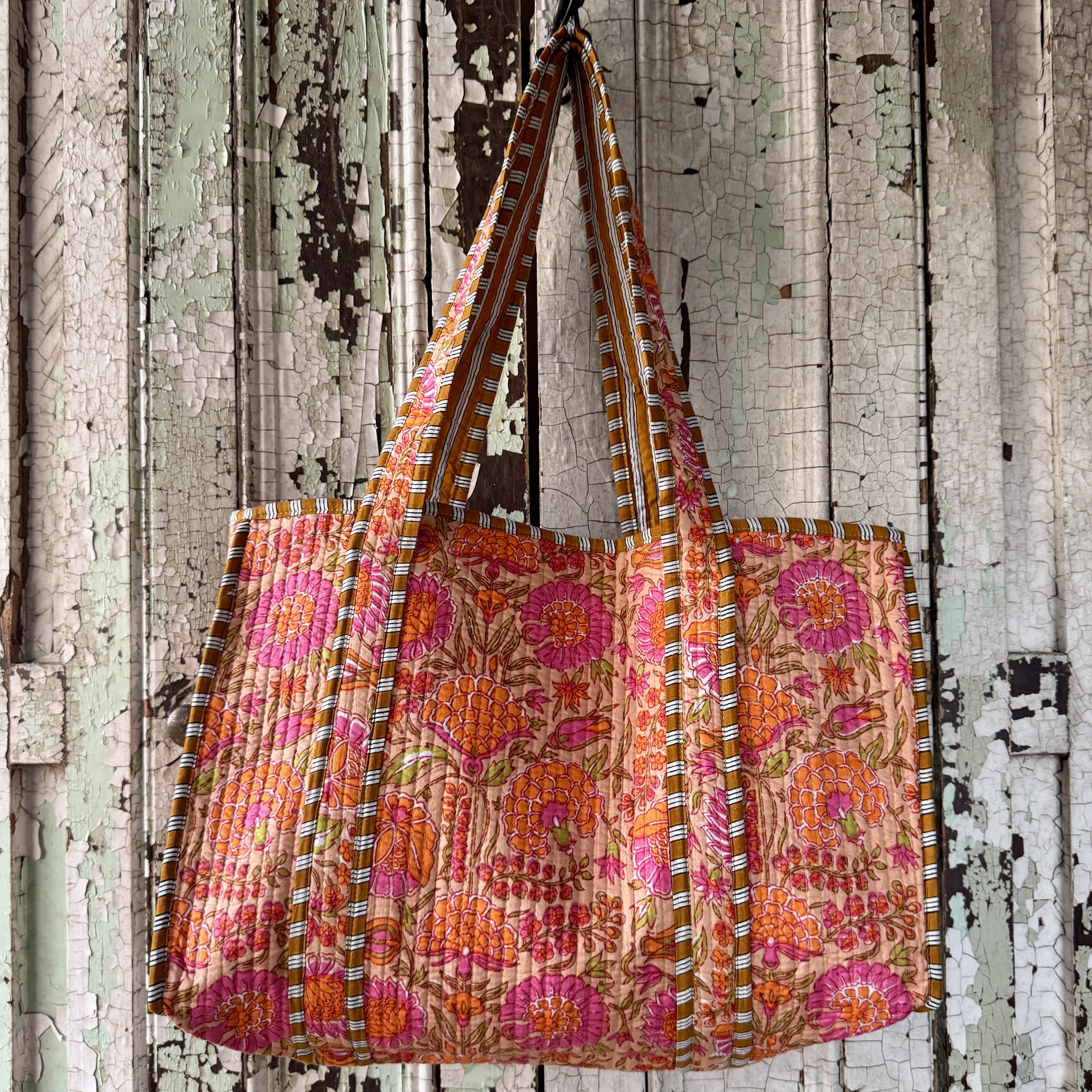 Add a burst of colour to your everyday with this handcrafted tote bag, featuring a lively orange and pink floral design. Made in Jaipur, India, these bags are created using the highest quality cotton and traditional block printing techniques, resulting in a beautifully unique finish every time. A practical and eye-catching piece perfect for shopping, the beach, or gifting.