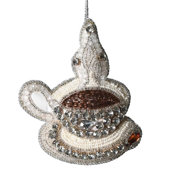 This beaded Americano Coffee decoration features an abundance of glistening jewels sewn onto a white satin material. With this warm coffee on your Christmas tree, it's bound to shine bright with elegance.