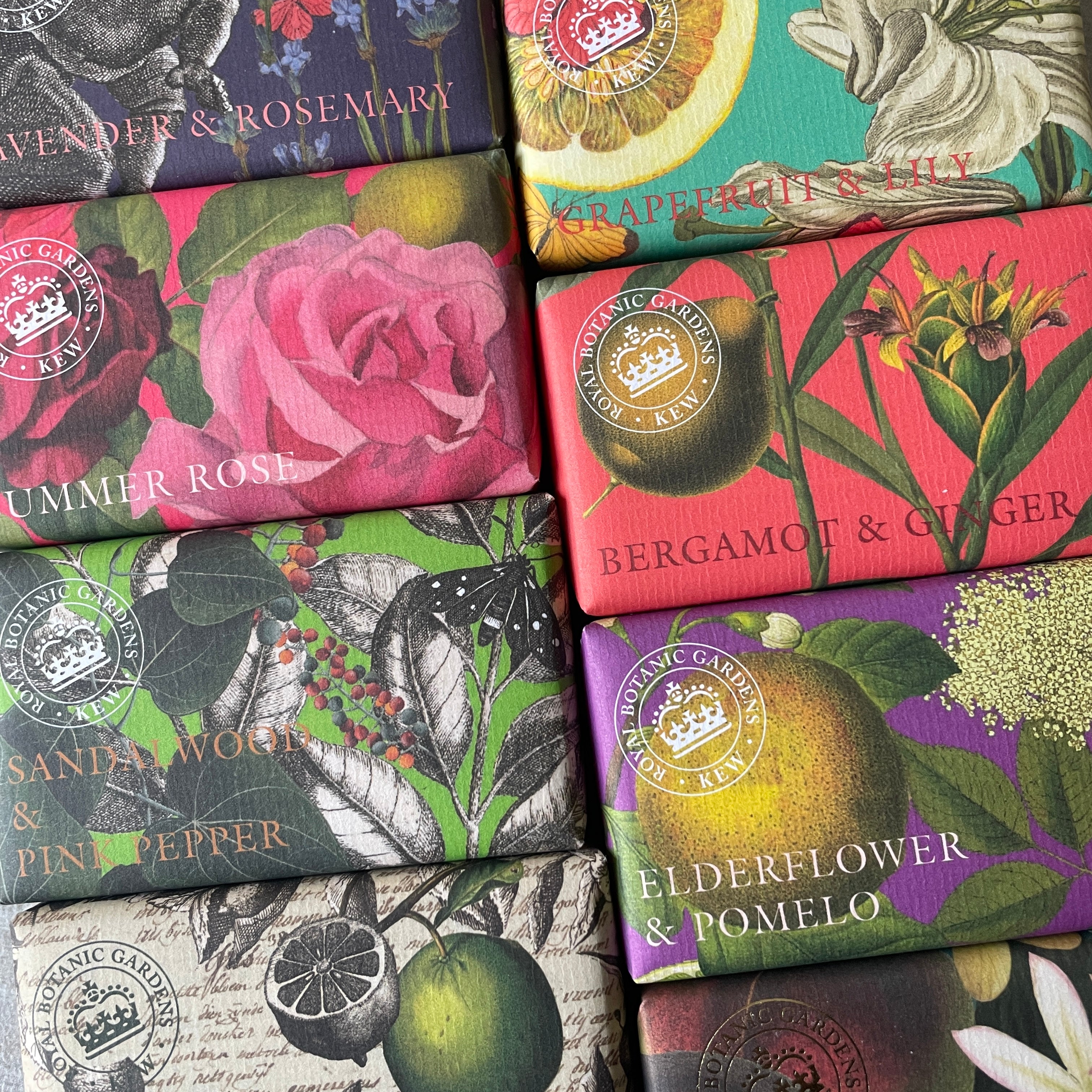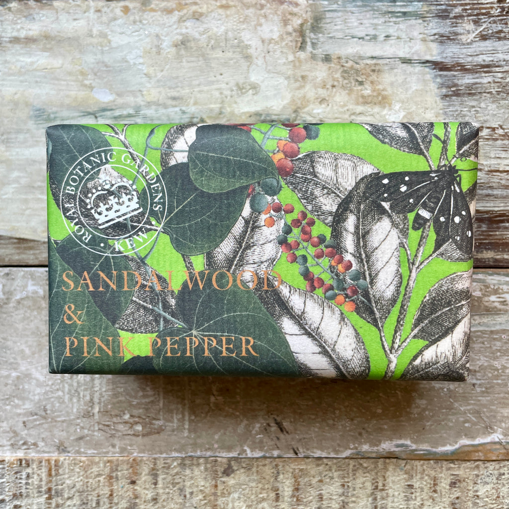 The Kew Gardens Sandalwood and Pink Pepper Soap is one of the exclusive soap bars in the Kew Gardens Collection. A generously sized 240g bar that is long-lasting and enriched with moisturising shea butter and vegetable glycerine to nourish and care for the skin. The paper wraps are printed with beautiful illustrations inspired by the plants, from Kew Garden’s historical archives.