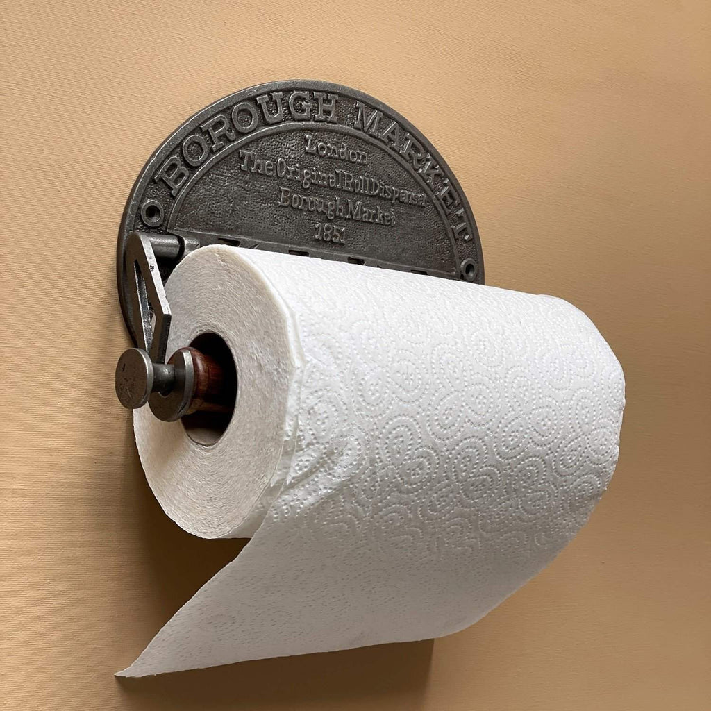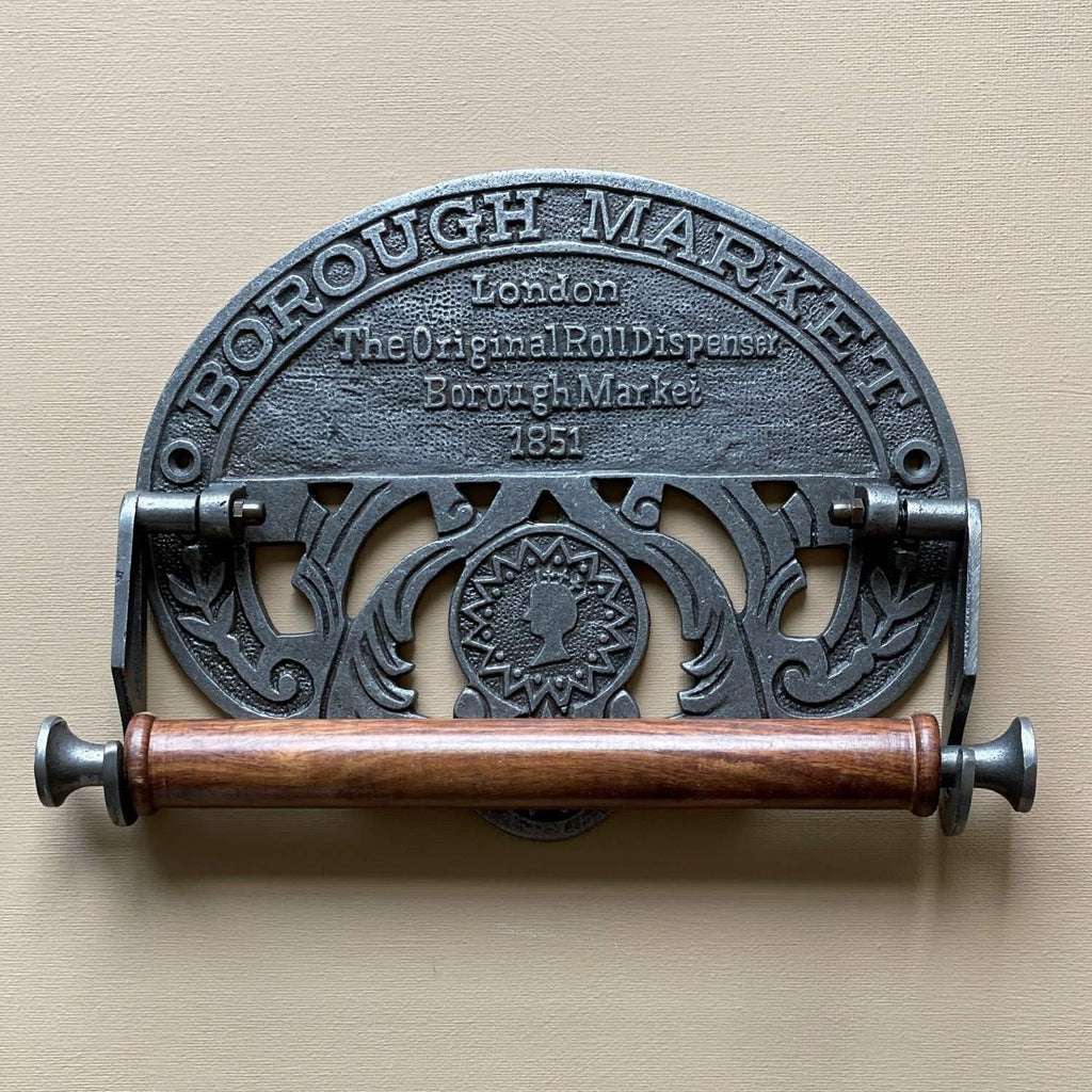 Handmade wall hanging cast iron kitchen roll holder with wooden bar. The inscription says: Borough Market, London. The Original Roll Dispenser Borough Market, 1851.