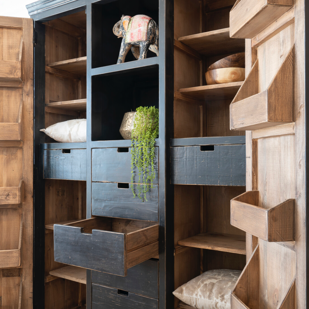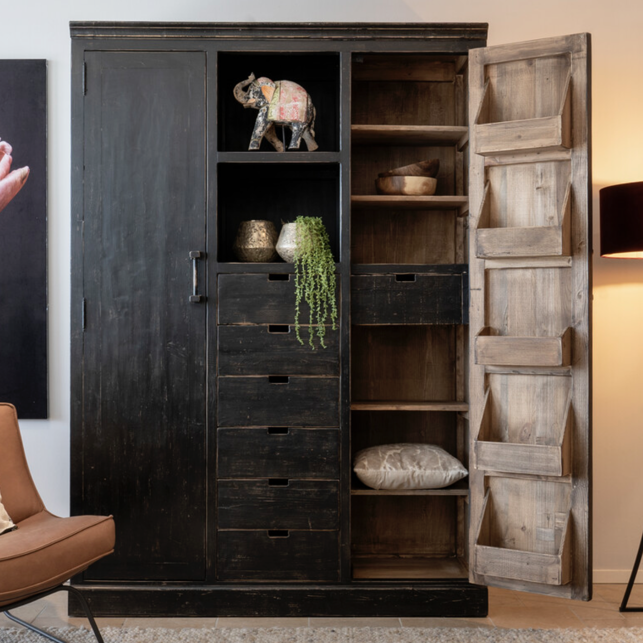 Solid black elm cabinet with a beautiful patina which adds a subtle touch of time. Has deep drawers and generous storage space and could hold a multitude of items, from old books and trinkets to heirlooms and keepsakes, all tucked away behind its vintage looking doors and drawers. Wether this is an addition to your hallway, living room or kitchen, it adds timeless charm anywhere in your home.