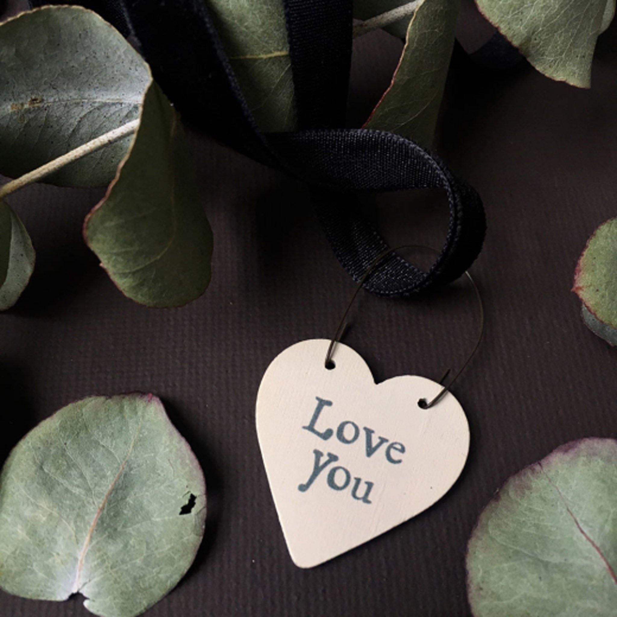 Make your gift extra special and thoughtful with these little heart sentiments. Made from cream painted wood, with grey font, each heart hangs from a metal wire hoop, and measures: 3 x 5.5cm.