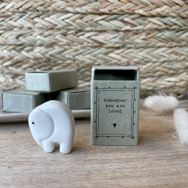 Sometimes it's the littlest gifts that mean the most. This delightful miniature porcelain elephant is perfectly pocketsized, comes complete in a kraft paper matchbox, bearing the words "Remember you are loved".