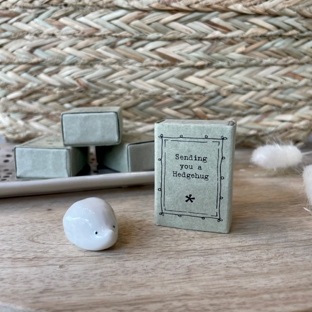 Sometimes it's the littlest gifts that mean the most. This delightful miniature porcelain hedgehog is perfectly pocketsized, comes complete in a kraft paper matchbox, bearing the words "Sending you a hedgehug".