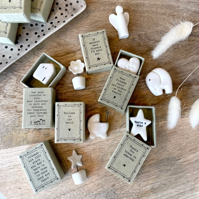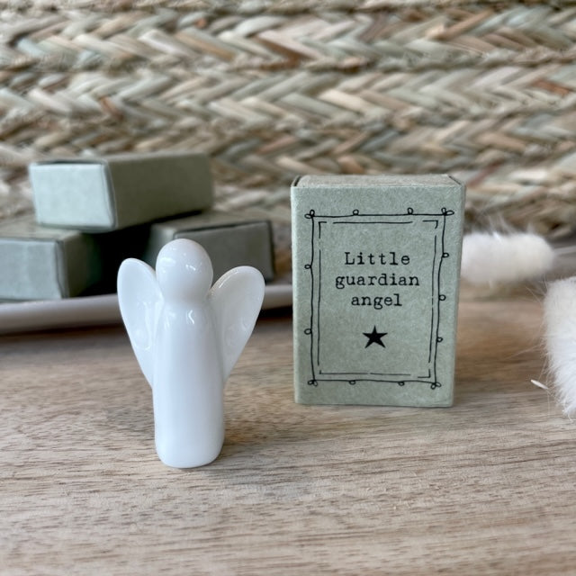 Sometimes it's the littlest gifts that mean the most. This delightful miniature porcelain Angel is perfectly pocketsized, comes complete in a kraft paper matchbox, bearing the words "Little Guardian Angel".