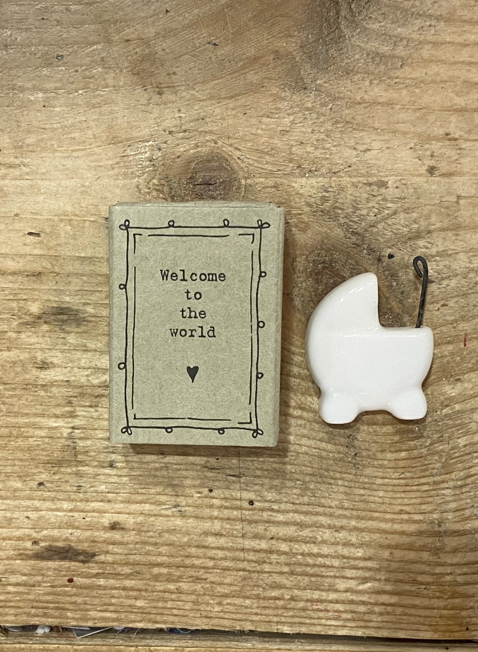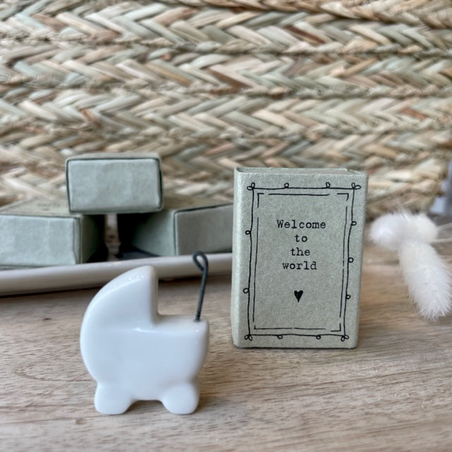 Sometimes it's the littlest gifts that mean the most. This delightful miniature porcelain Pram is perfectly pocketsized, comes complete in a kraft paper matchbox, bearing the words " Welcome to the world"