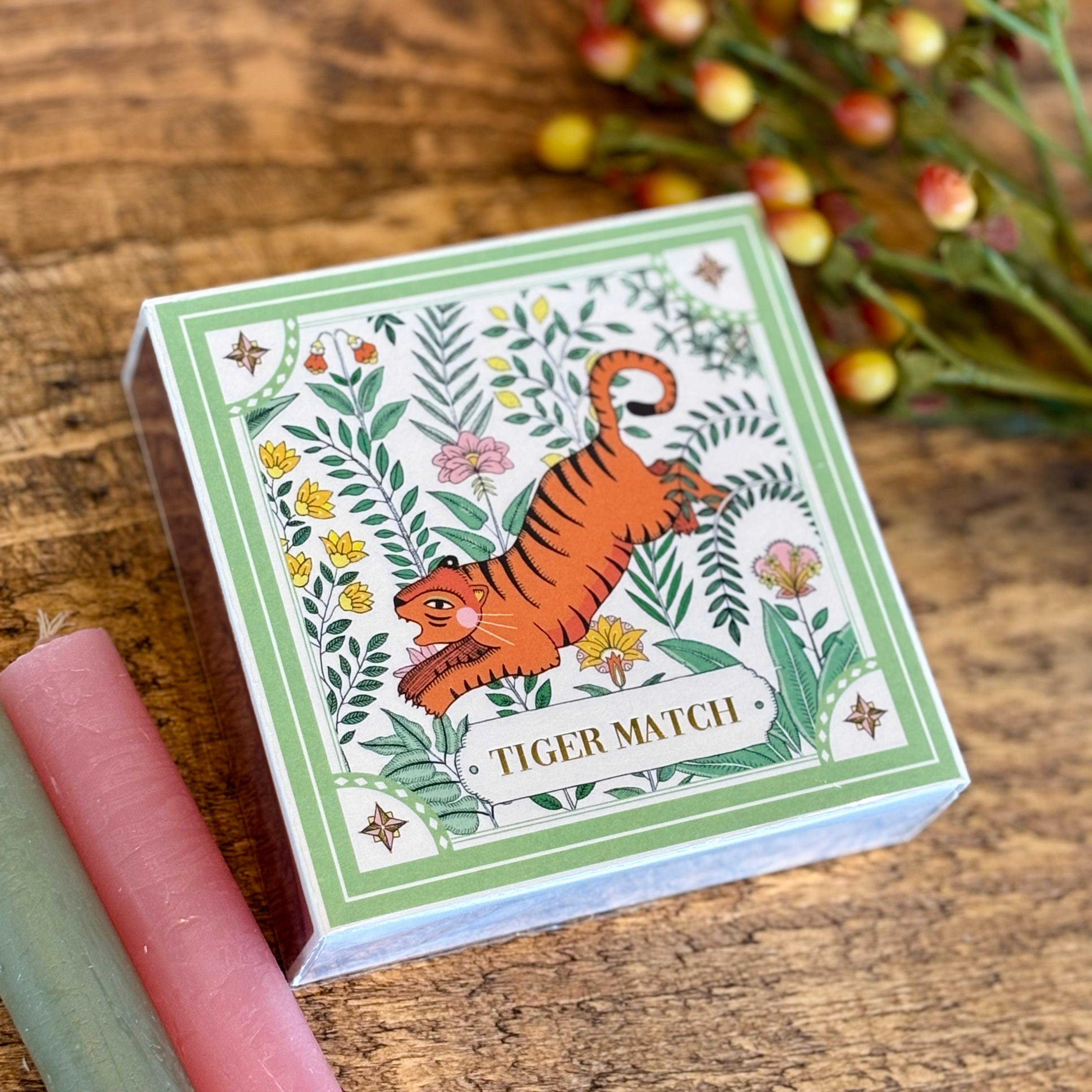 The ‘Green Floral Tiger’ matchbox measures 11cm square, and contain approx. 125 matches with white tips. The beautiful variety of green ferns and flowers contrasting against the bold orange tiger creates a stunning design.