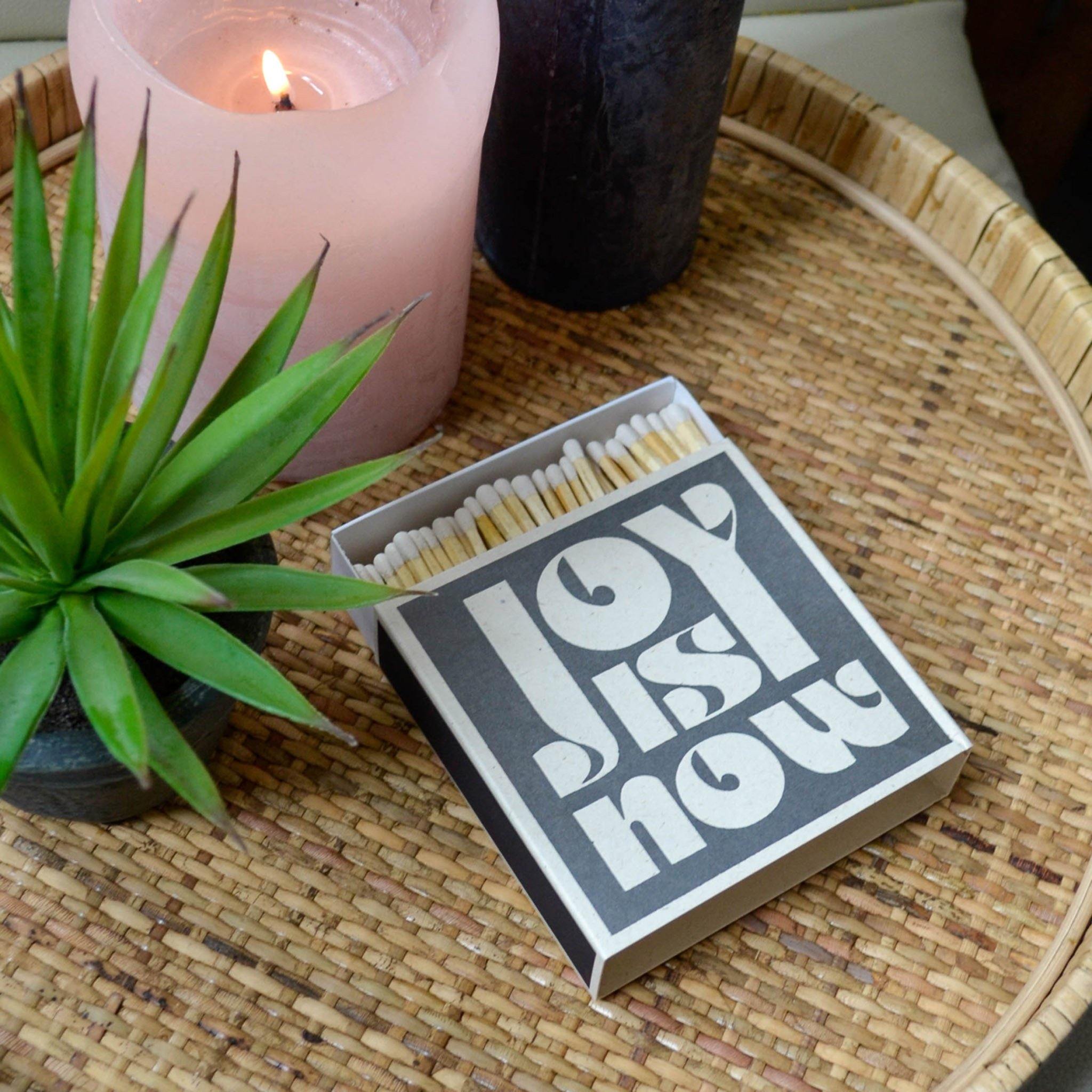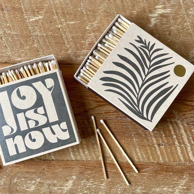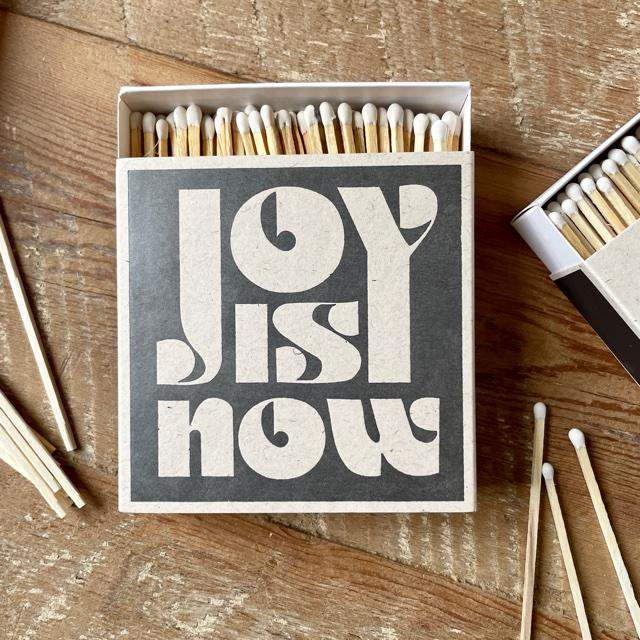 This matchbox is grey with the words; JOY IS NOW, in white and make a wonderful gift. The ‘Joy is now’ matchbox measures 11cm square, and contain approx. 125 matches with white tips.