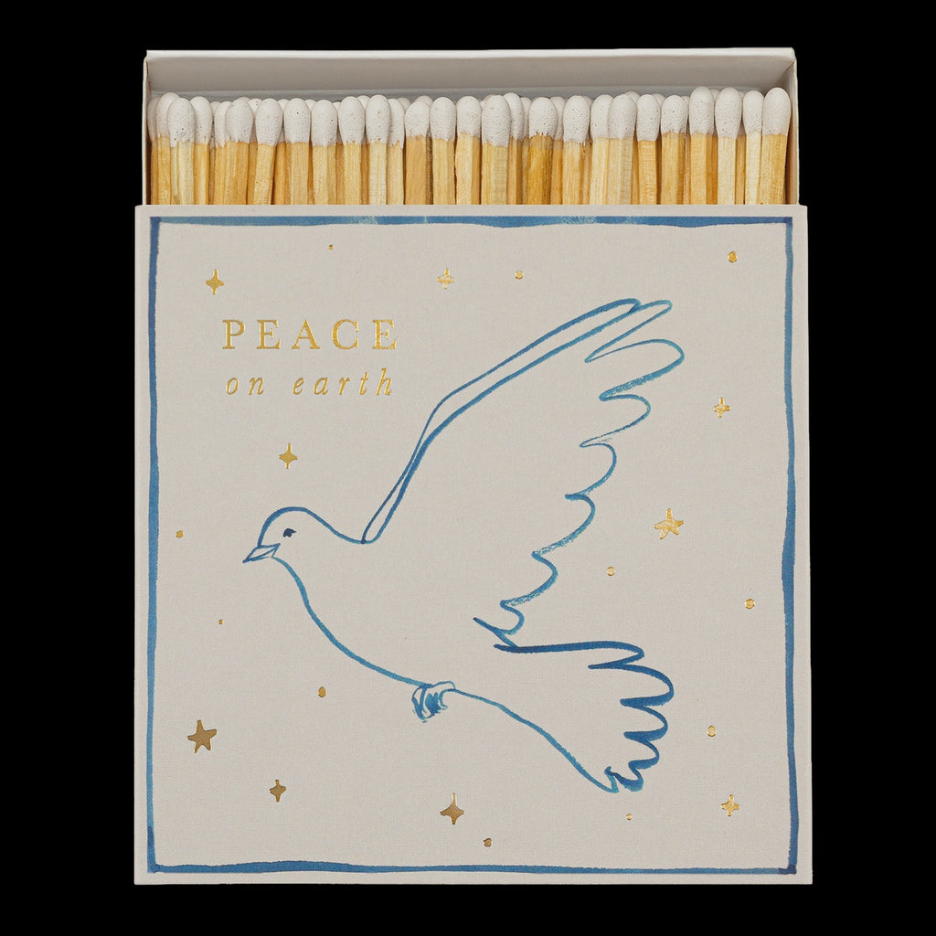 If you’re anything like us and have candles burning regularly, you’ll want some quality matches to hand. Matches - Peace Dove measures 11cm square, and contain approx. 125 matches with white tips Dimensions: 110 x 110 x 30 mm Need to Know: Contains 125 matches, each measuring 100mm Long | Natural Sticks with red tips | White Tray How It Is Made: Letterpress Printed in the UK. Product Care: These matches are made from natural products and may contain inherent structural flaws. Whilst we take time to test the matches, we cannot reasonably test every single one, so strike the match gently (easy does it!) and away from you, over non-combustible surfaces. Sustainability: Wrapped in a compostable cello | Made with FSC certified wood