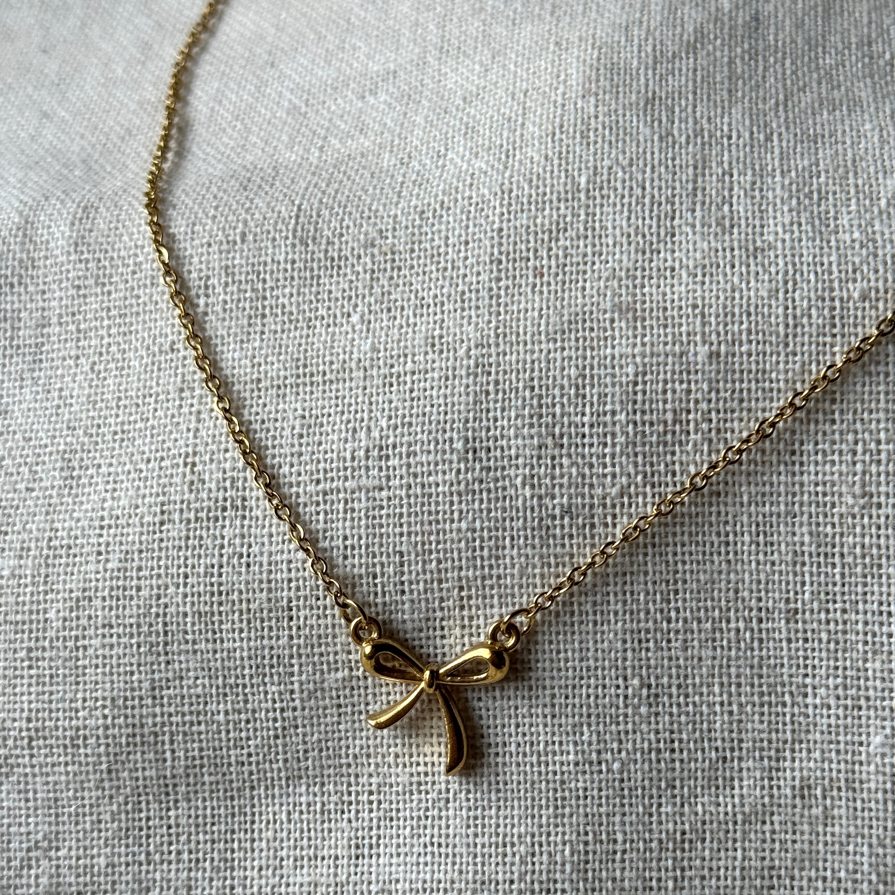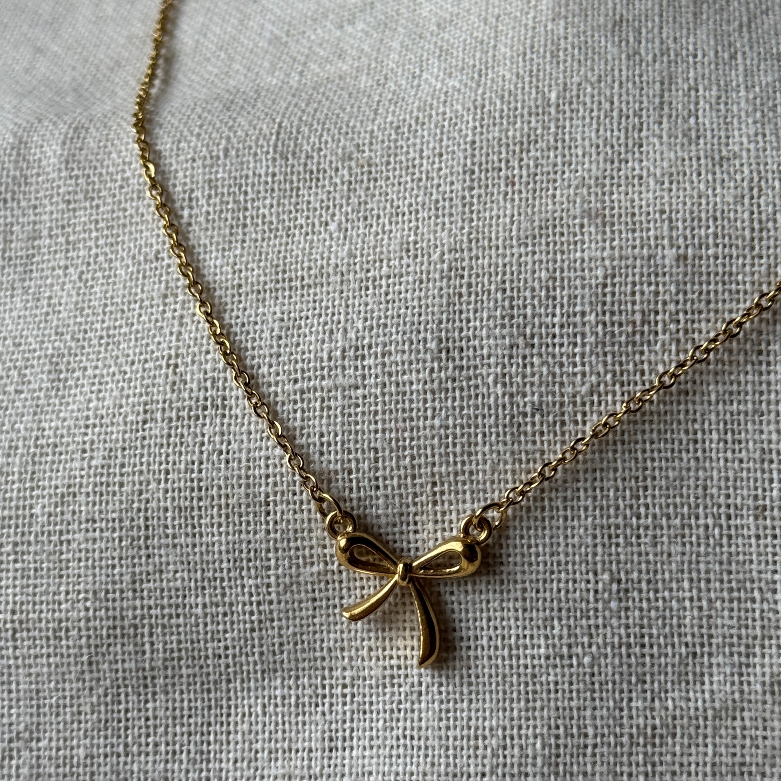 Necklace - Dainty Bow Chain, Gold. This waterproof necklace will add instant feminine chrm to any outfit, perfect to layer with other chains - A gorgeous gift for yourself or a friend.