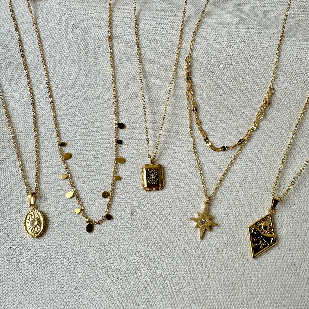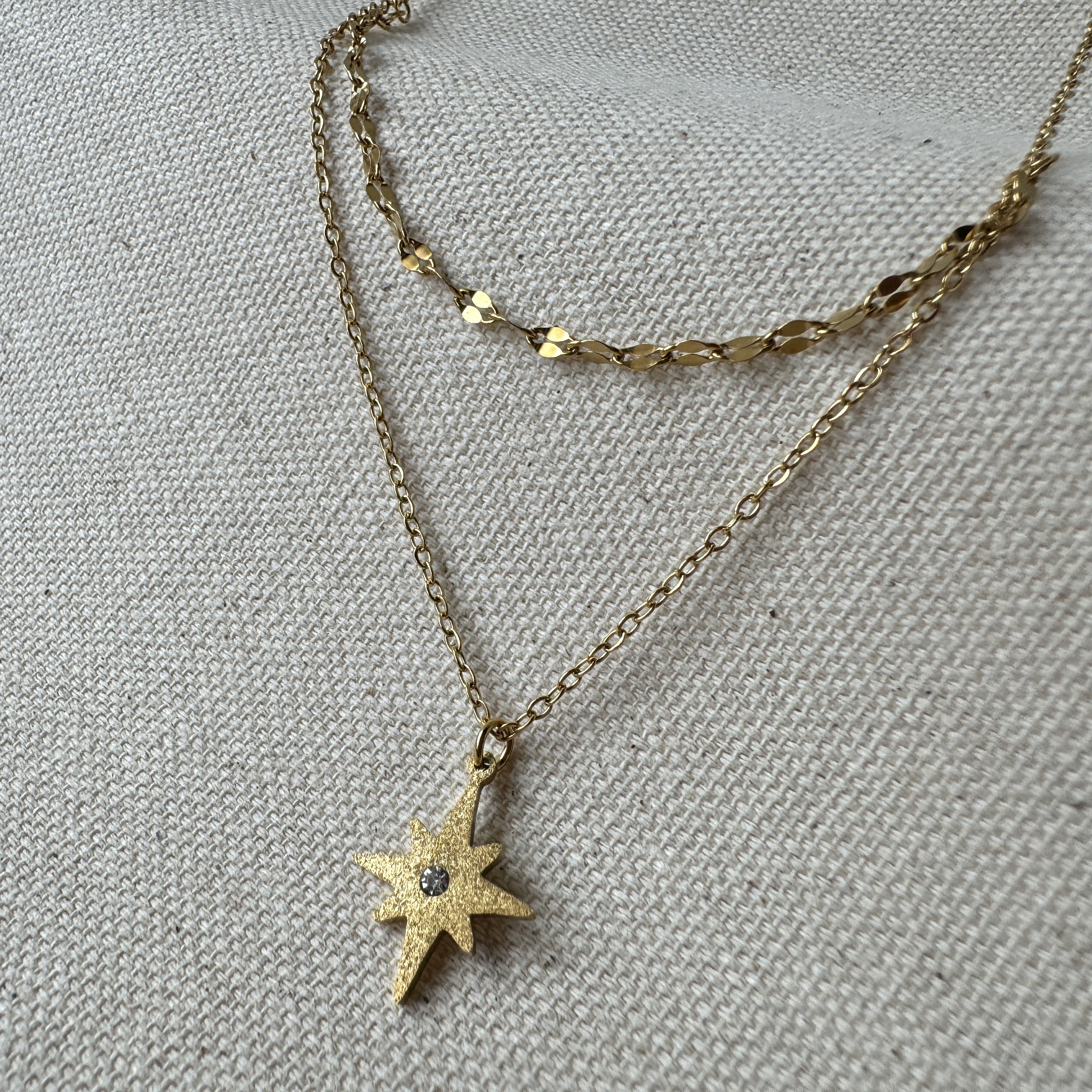 Everyday Necklace - Gold 2 Layer Chain CZ Star . This waterproof necklace will add instant celestial sparkle to any outfit. Perfect to layer with other chains, this chain features a double layer, of contrasting chains finished with a textured star charm inlaid with Cubic Zirconia- A gorgeous gift for yourself or a friend.