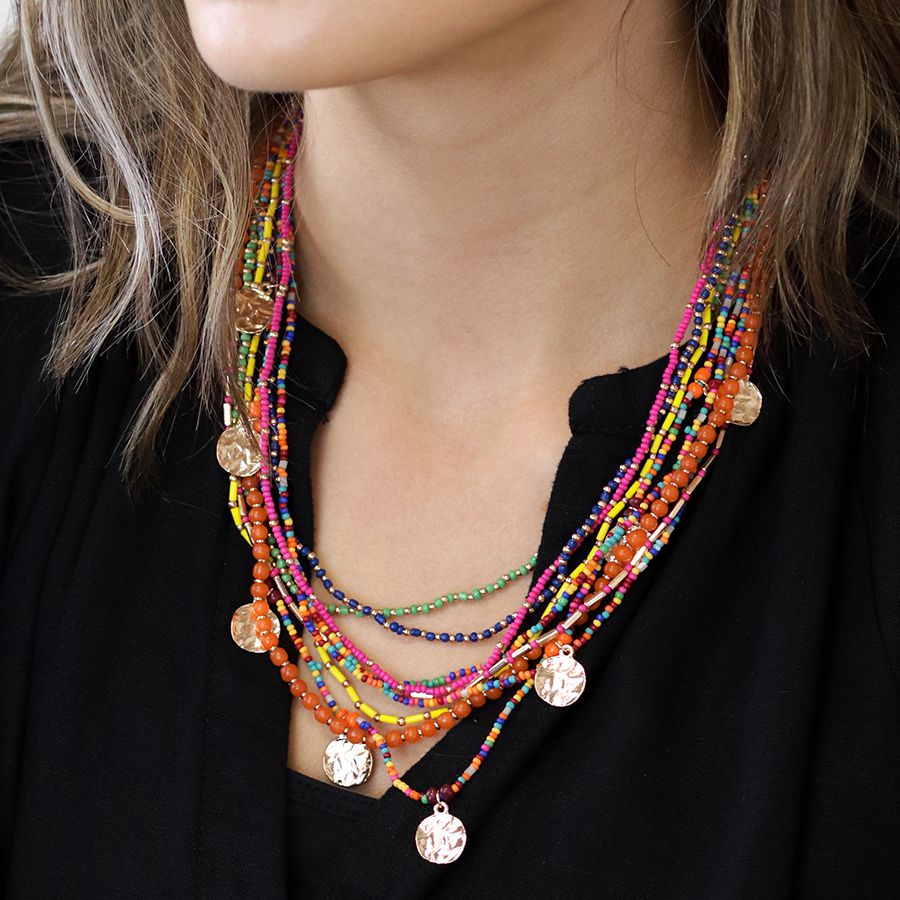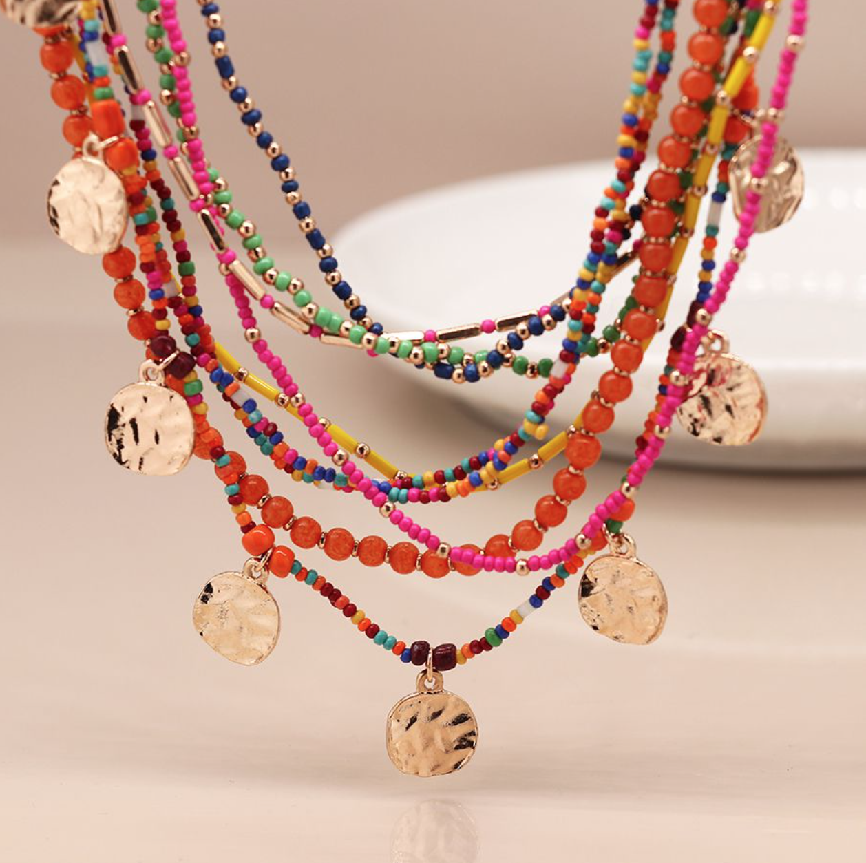 This beautiful short multi strand necklace features a vibrant mix of orange, yellow, pink and green beads and hammered metallic discs. Perfect to brighten up outfits this summer.