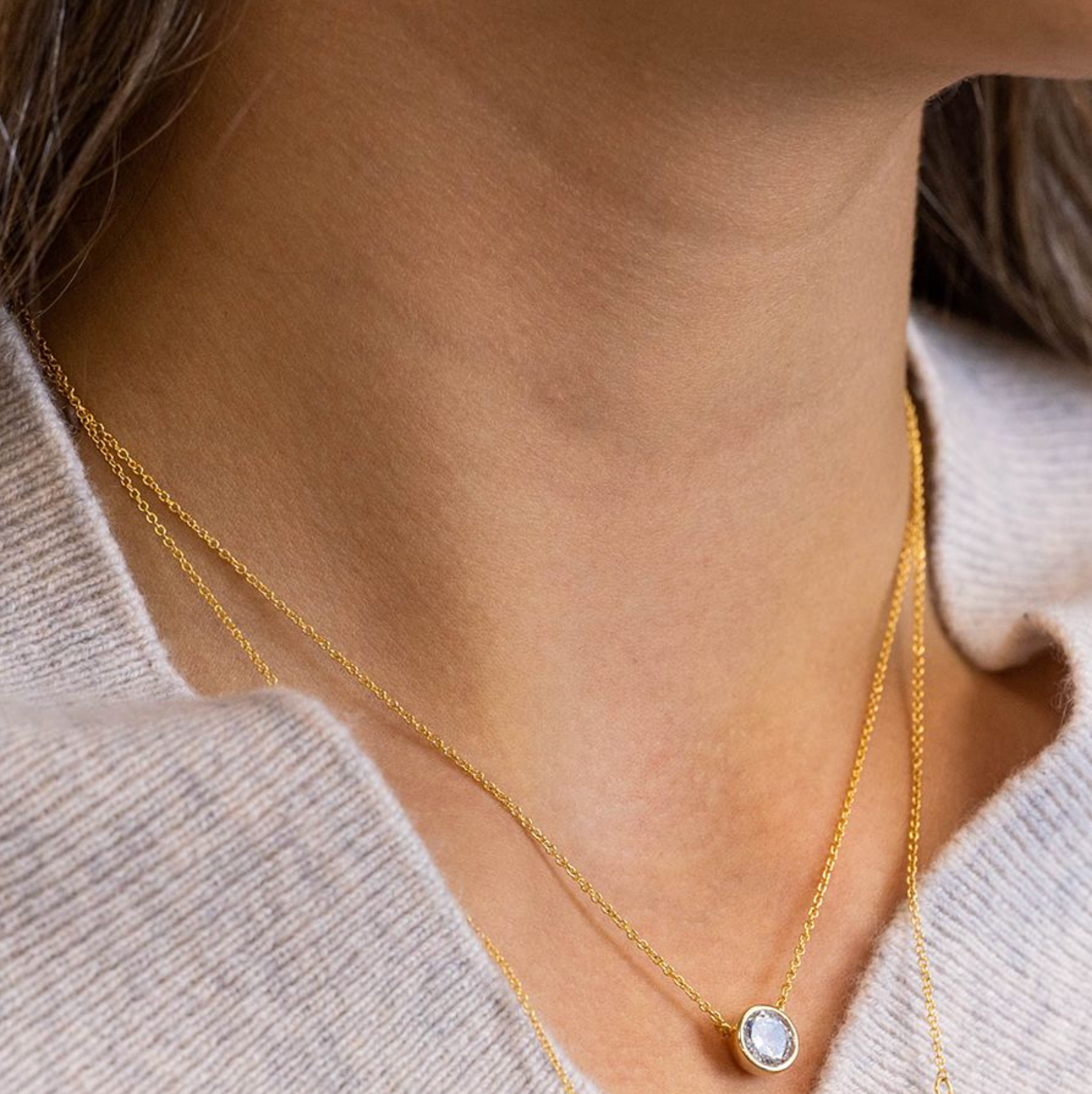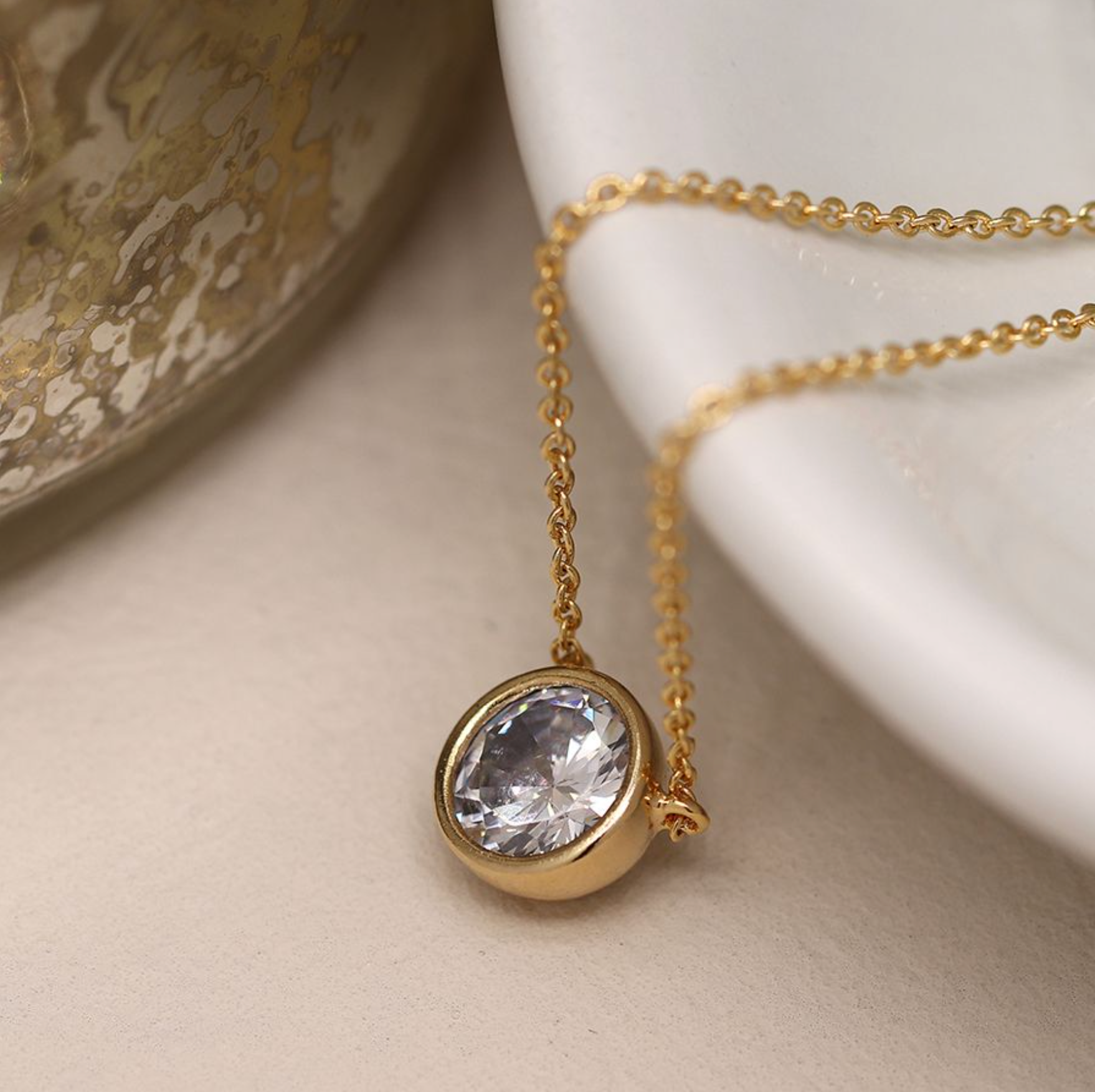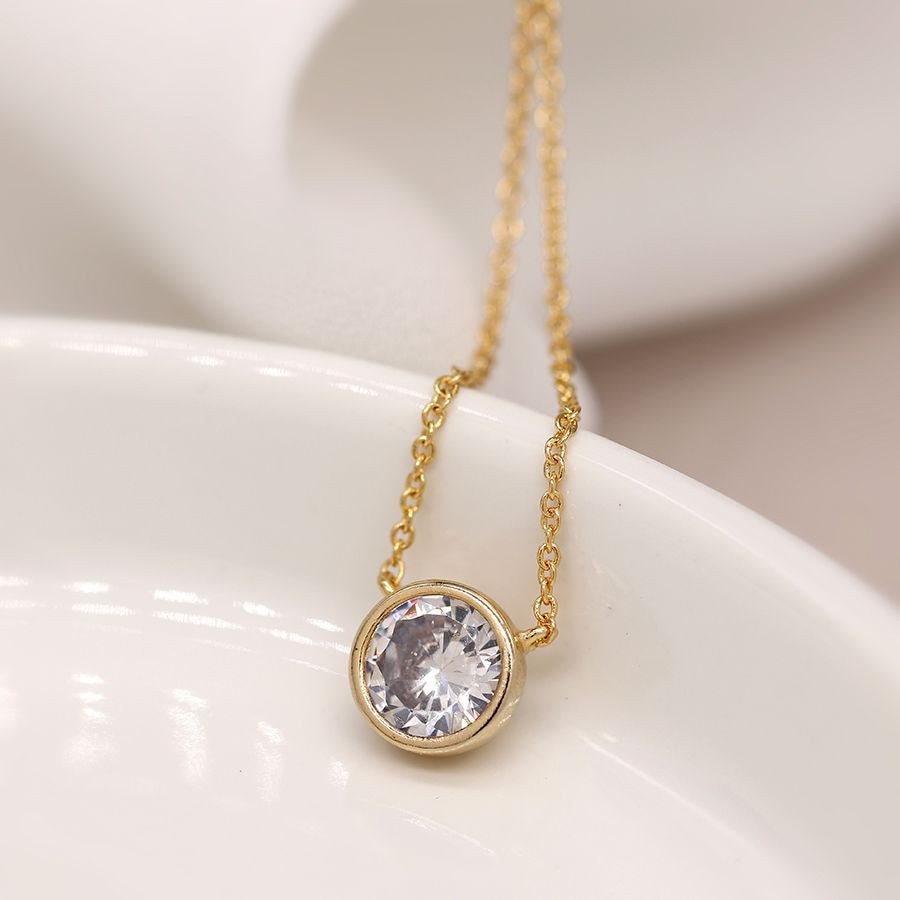 Necklace - Short Golden with round CZ Crystal - this timeless stone drop necklace is perfect to add a touch of sparkle to a simple outfit.