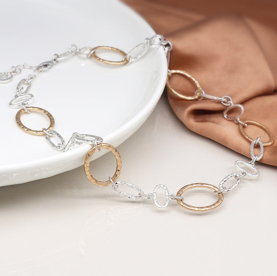 Featuring silver plated linked hoops the necklace is interspersed with larger faux gold plated hoops in a worn finish and hammered texture.