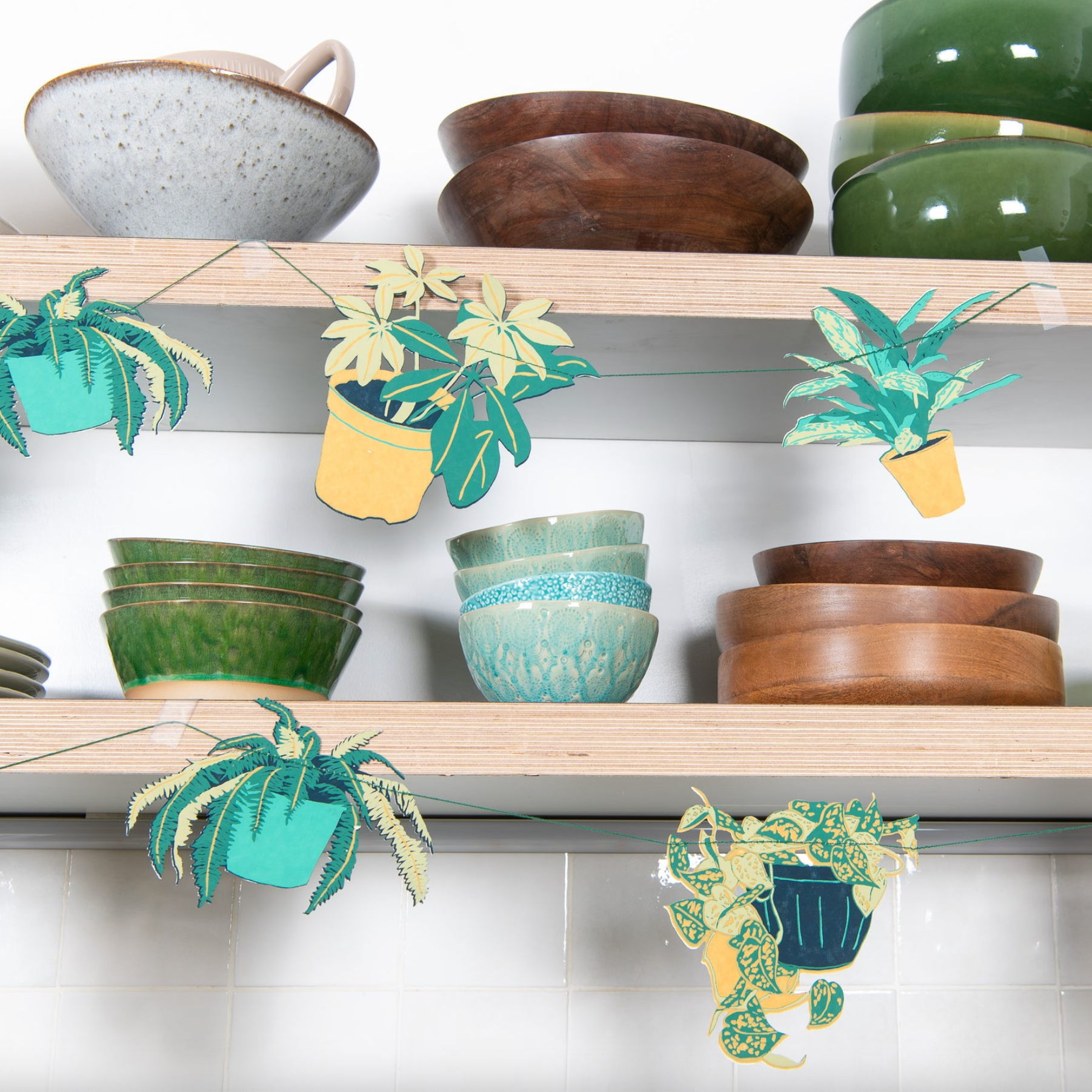Paper Garland - Houseplants, 3m. Easy to keep alive, these 10 vibrant paper pot plants are sewn along this garland. Perfect for adding greenery to your home with no watering required!A great way to add a little party to any occasion!