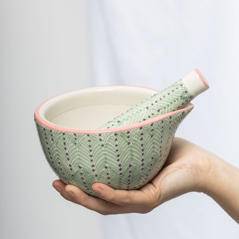 Pestle & Mortar - Ceramic, Hand Stamped, Green Pattern will elevate your culinary game! Perfect for grinding spices, making pastes and dressings.