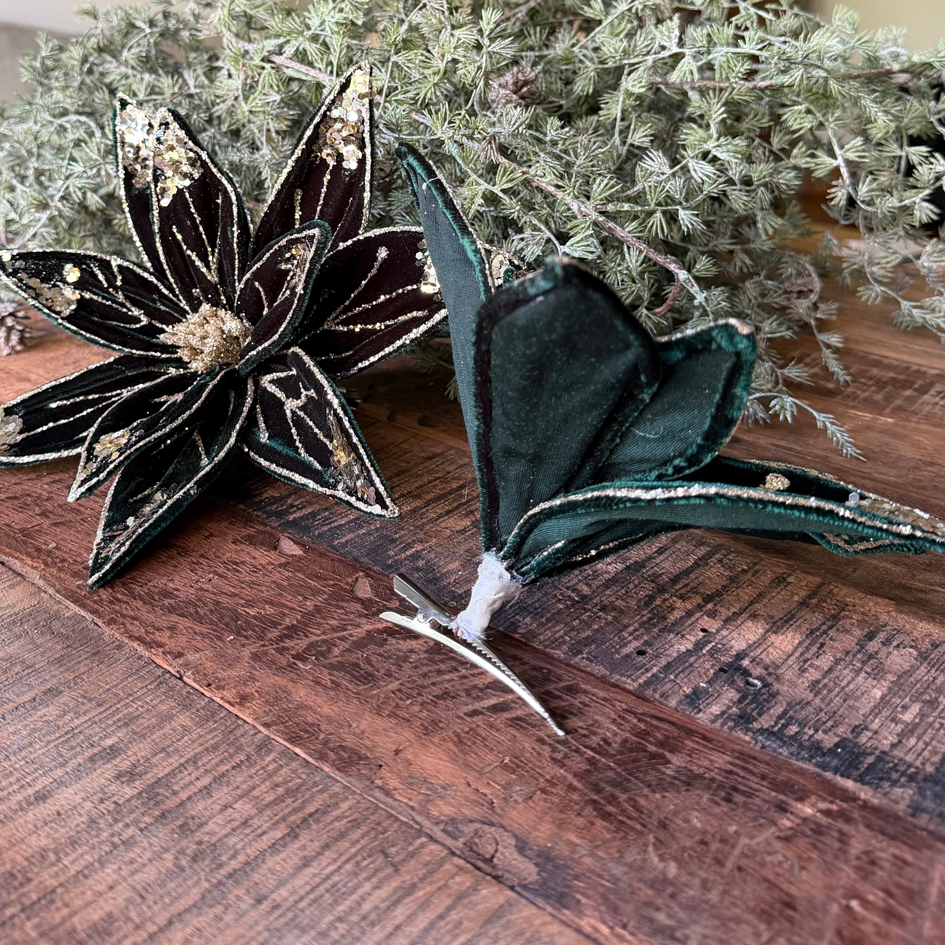 Add festive sparkle with our Emerald and Gold Glitter Poinsettia! ✨ Velvet petals trimmed in gold glitter and delicate sequins make this flower a stunning accent for your tree or wreaths. The tiny alligator clip makes it easy to attach anywhere for an instant touch of impactful elegance.