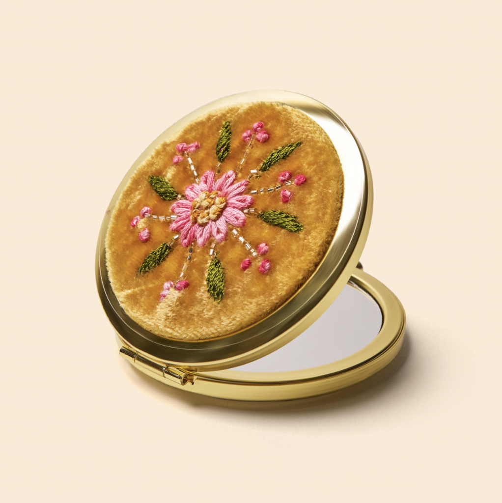 This pocket mirror features a mustard coloured delicate, embroidered design. Compact and stylish, it’s perfect for slipping into your bag for on-the-go touch-ups or as a thoughtful gift.