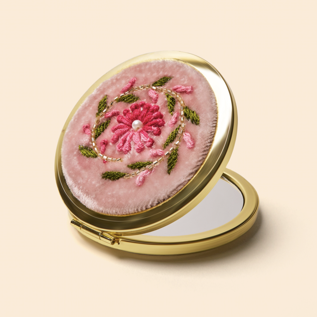 This pocket mirror features a pink coloured delicate, embroidered design. Compact and stylish, it’s perfect for slipping into your bag for on-the-go touch-ups or as a thoughtful gift.