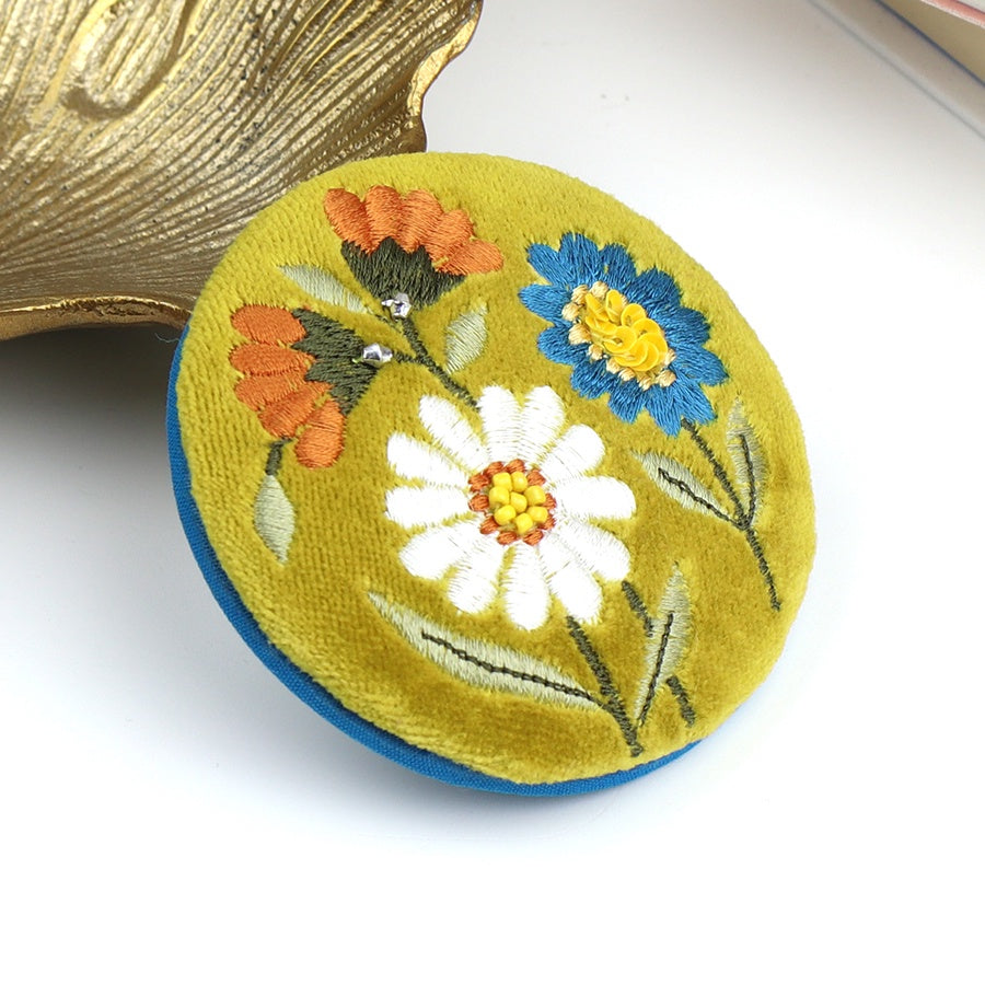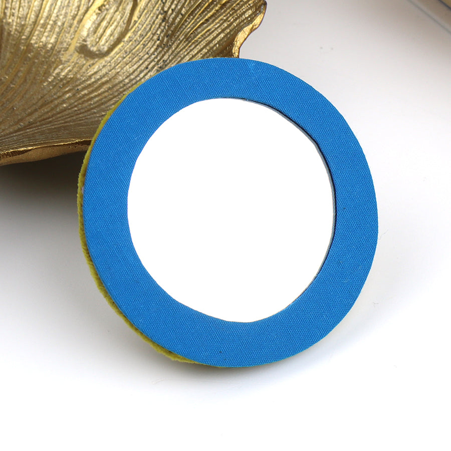 Beautiful compact pocket mirror edged in bright blue with a chartruse velvet back featuring an embroidered autumn scene.